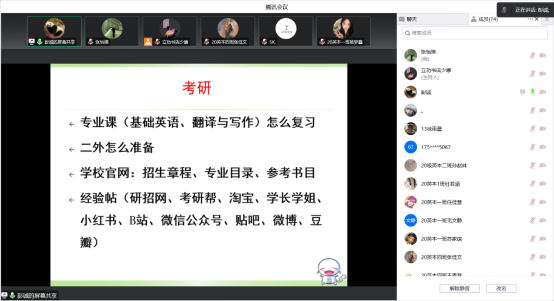 为了调节静态管理期间员工的心理状态,引导同学们转移对疫情的焦虑,同时给英语专业2020级有意向的考研学子们提供考研指导,太阳成集团tyc33455cc英语教研室于2022年10月21日晚7点至9点以腾讯会议的方式举办了线上考研指导讲座。会议由英语教研室苏小强、高保欣和彭诚三位老师主讲。
