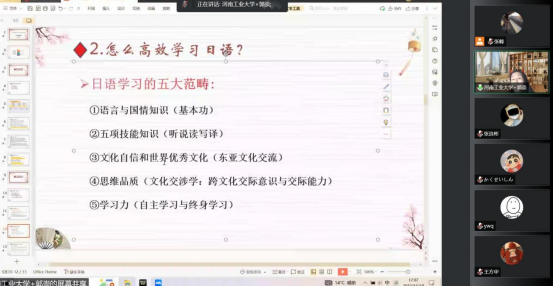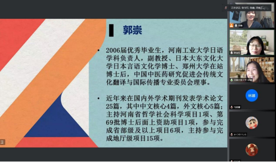 11月18日(星期五)下午16:00-18:00,太阳成集团tyc33455cc日语教研室很荣幸邀请到公司日语专业2006届优秀毕业生,河南工业大学日语学科负责人郭崇副教授为日语专业在校师生进行“新文科背景下日语员工出路及专业发展探索”的专题讲座。此次讲座在腾讯会议线上举行,日语教研室主任张峰老师主持,日语专业全体师生在线聆听。
