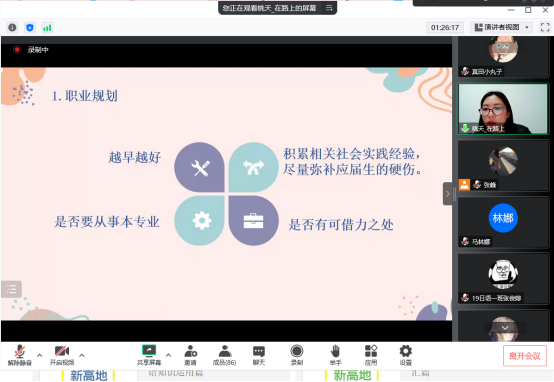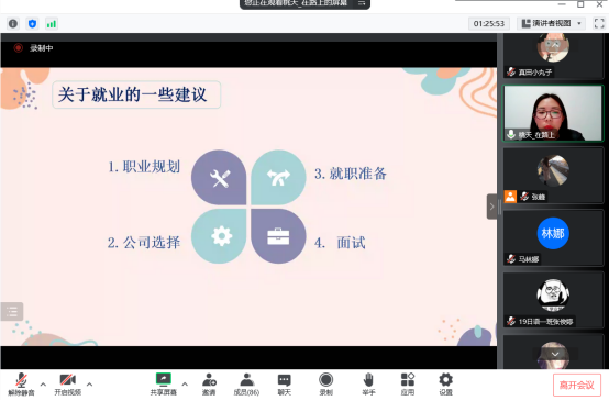 最后,在就业方面,袁晓艳部长从职业规划、公司选择、就职准备和面试四个方面给同学们提了许多非常实用的建议。