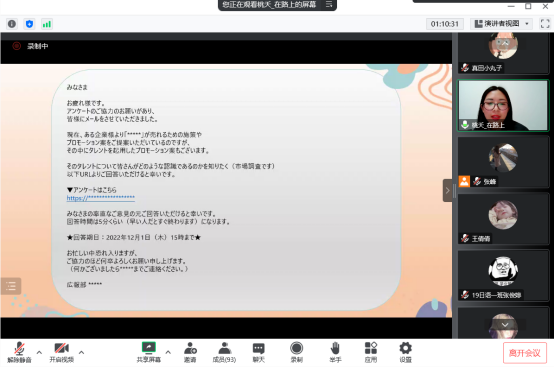 袁晓艳部长在讲座中途还用了自己工作时的日语邮件,为员工们讲解实际工作时用到的日语措辞,可以看出和大学时学到的知识有不同之处,帮助员工们对以后的职场生活有了一个更加清晰的认识。