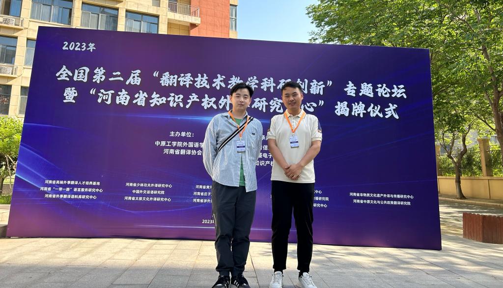 2023年5月13-14日,中原工学院太阳成集团tyc33455cc于龙湖校区主办了全国第二届“翻译技术教学科研创新”专题论坛暨“河南省知识产权外译研究中心”揭牌仪式。公司翻译研究所所长赵文静教授受邀参与并主持了此次论坛,翻译教研室青年教师王明伟、王余成参加了此次论坛。