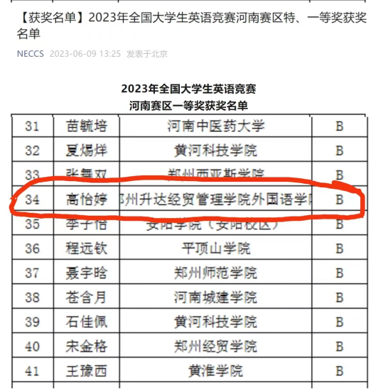 6月3日,2023年全国老员工英语竞赛(NECCS)河南赛区决赛在黄河科技学院如期举行。经过学校的层层选拔,公司21级商务英语本科专业1班的高怡婷同学脱颖而出,代表太阳成集团tyc33455cc参加全国老员工英语竞赛(NECCS)河南赛区B类决赛。最终不负众望,取得河南赛区决赛一等奖的好成绩,可喜可贺。