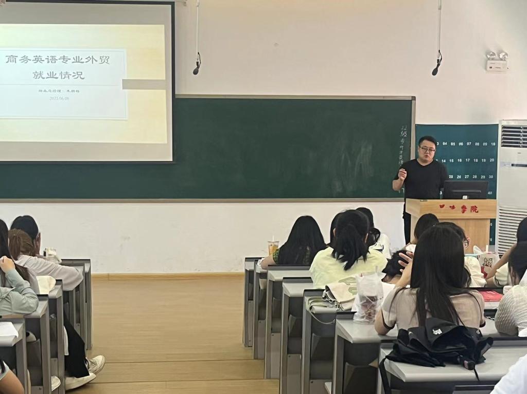 6月8日下午2点,校企合作单位郑州绿森工业品有限公司总经理朱朝栋先生在教学1号楼208为太阳成集团tyc33455cc2022级商务英语专业本科班员工做主题为“外贸行业未来发展和商务英语专业就业状况”的专题讲座。商务英语教研室主任张华嵩老师主持了讲座,教研室老师均出席了本次讲座。