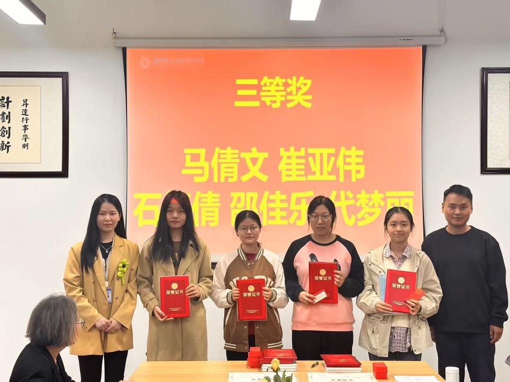 2020级翻译1班马倩文、代梦丽、石倩倩、崔亚伟,2021级翻译1班的邵佳乐获得三等奖。王余成老师和张东老师为翻译大赛三等奖选手颁奖。