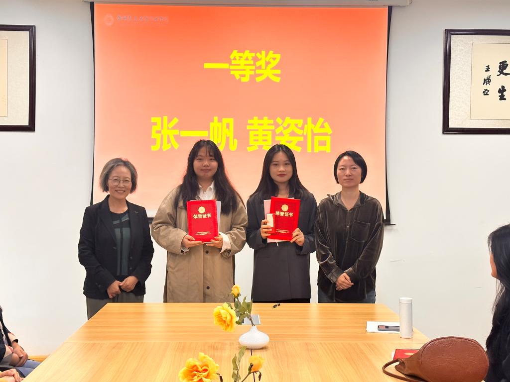 本次翻译大赛中,来自2020级翻译1班的张一帆,2020级翻译2班的黄姿怡获得一等奖。崔经理和赵教授为翻译大赛一等奖选手颁奖。