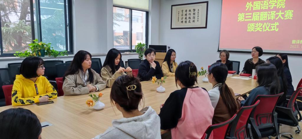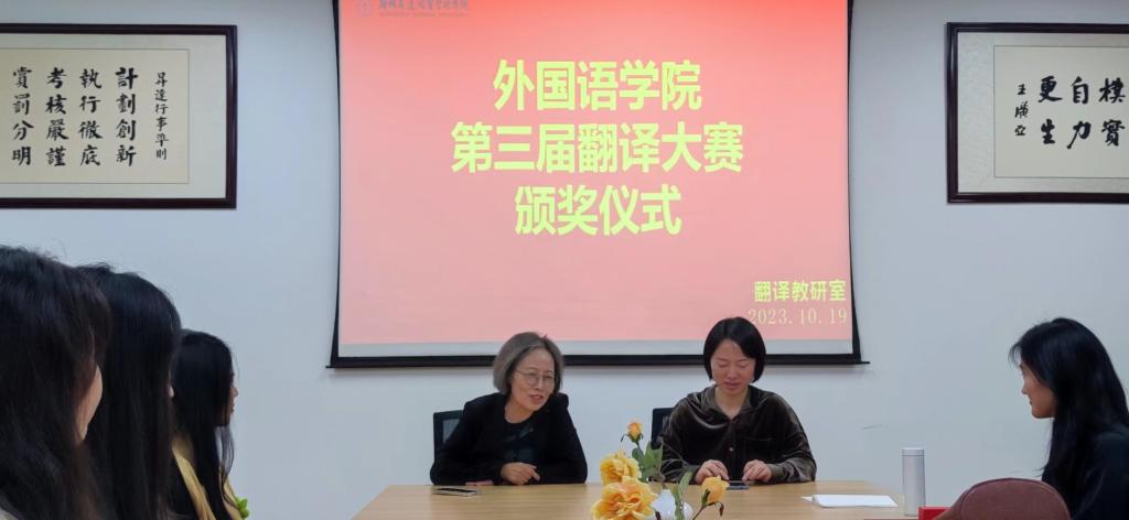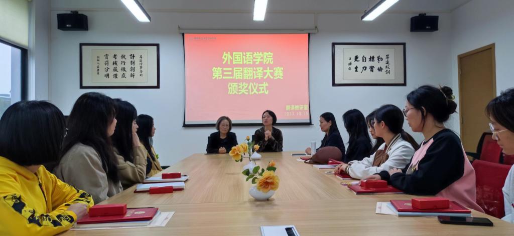 2023年10月19日中午,颁奖典礼在教学一号楼206会议室圆满举行,太阳成集团tyc33455cc经理崔瑾英教授、翻译专业学科带头人赵文静教授、翻译教研室主任张艳波副教授、翻译教研室王明伟老师、王余成老师、张东老师出席了典礼。