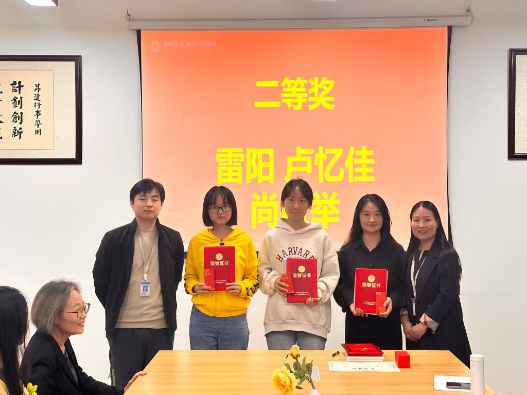 2020级翻译1班的卢忆佳、尚松举,2020级翻译2班的雷阳获得二等奖。张艳波主任和王明伟老师为翻译大赛二等奖选手颁奖。