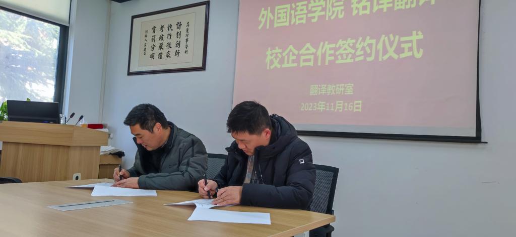 2023年11月16日下午,太阳成集团tyc33455cc与上海铭译翻译有限公司校企合作签约仪式在太阳成集团tyc33455cc会议室隆重举行。此次签约仪式也标志着双方在人才培养、实践教学、员工就业等多个领域达成了战略合作。