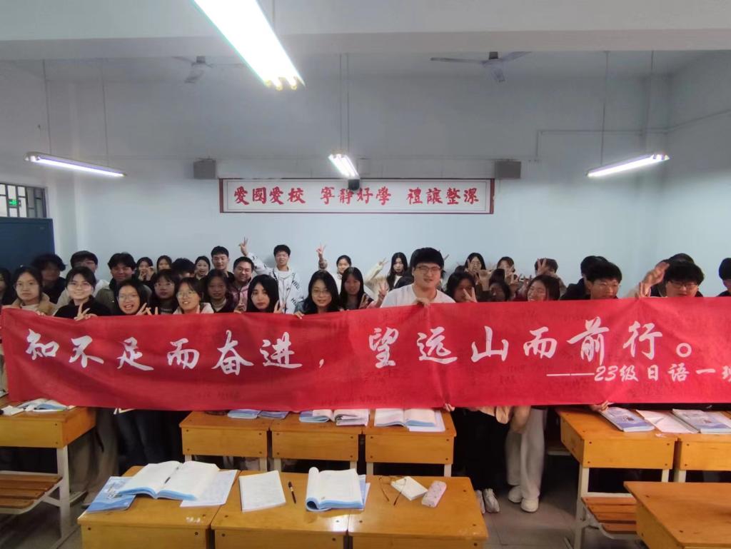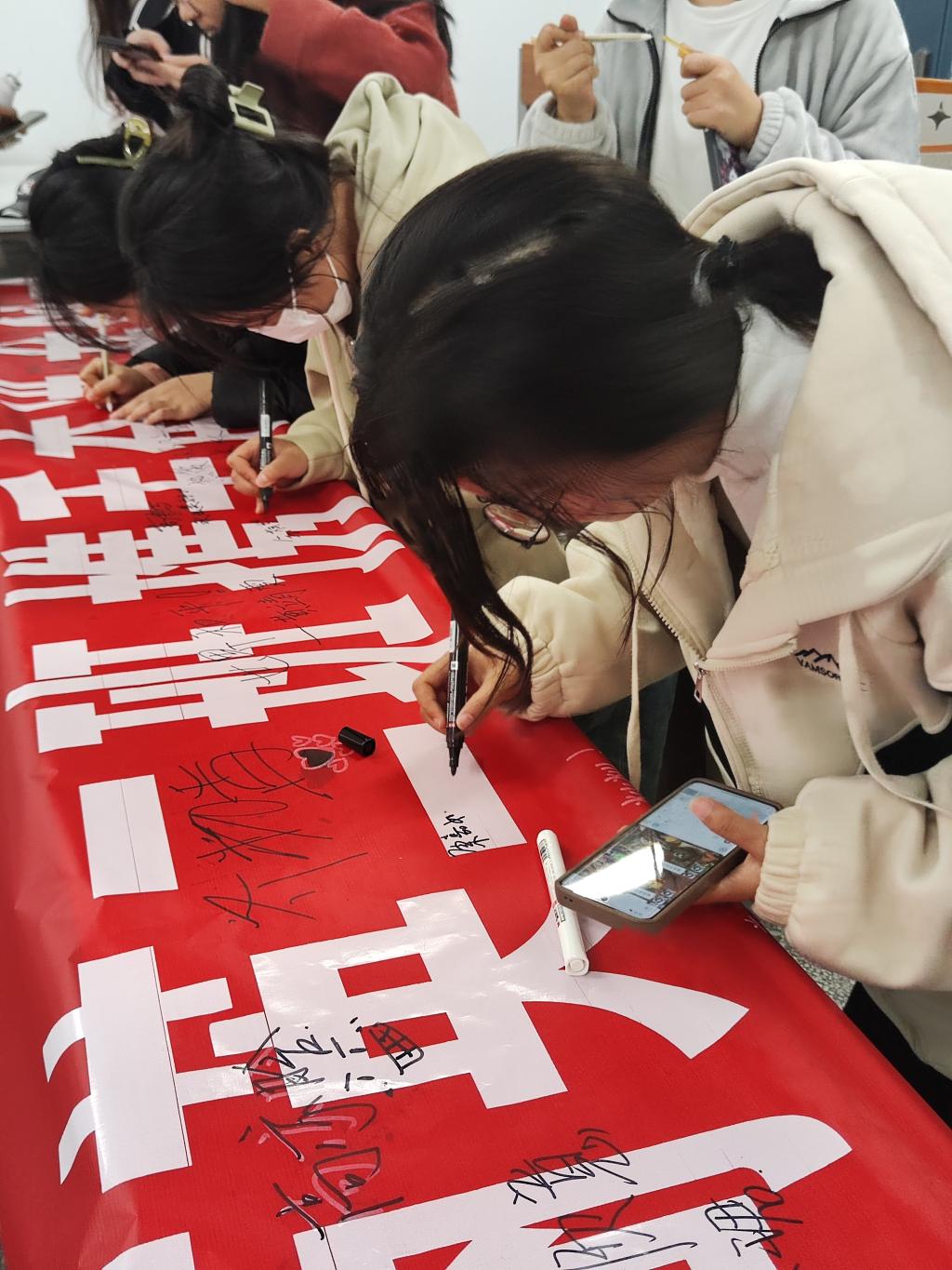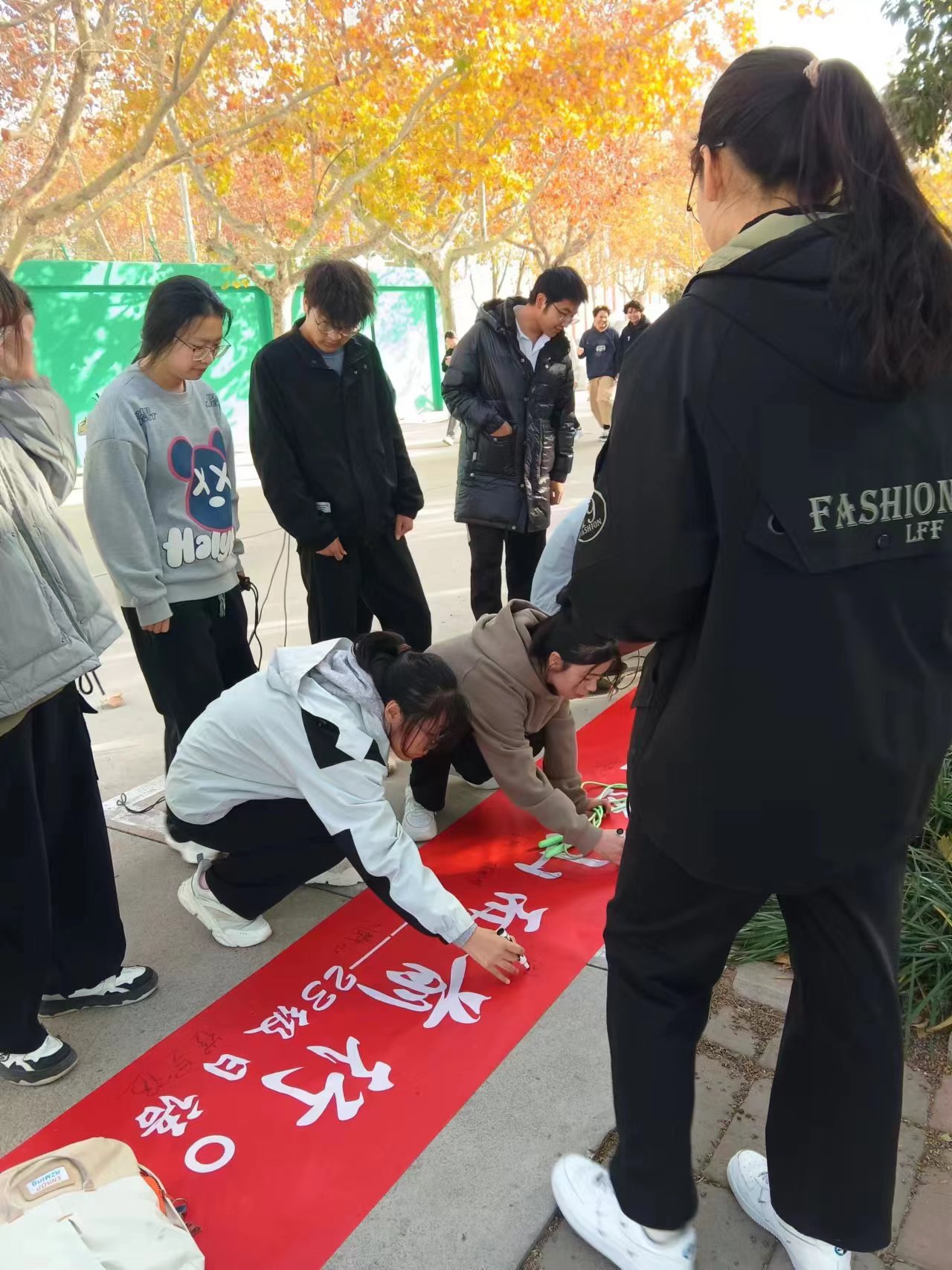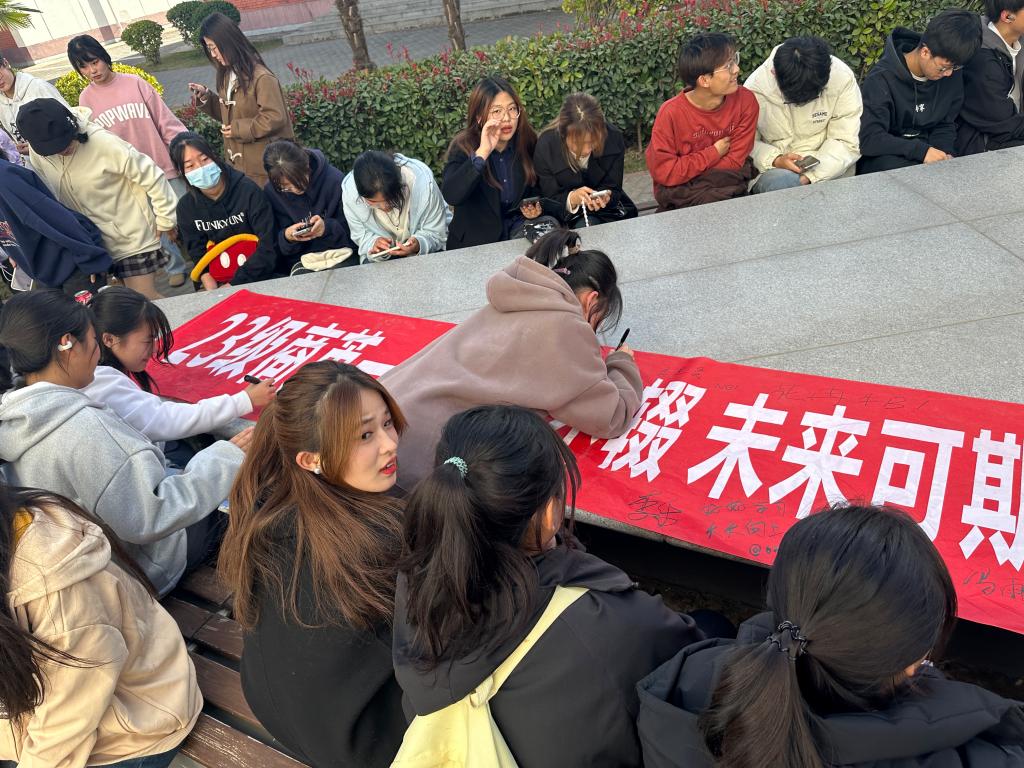 为了彰显“好学月”主题,加强班级凝聚力、向心力,12月8日下午1点,2023级商务英语本科1班、2班、2023级日语本科1班员工以班级为单位,分别在教学1号楼、综合楼、升达操场举办横幅签名祝福语活动。