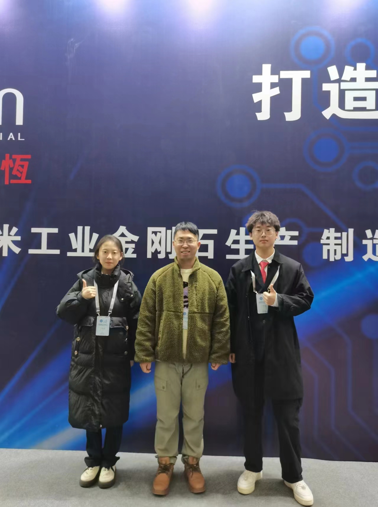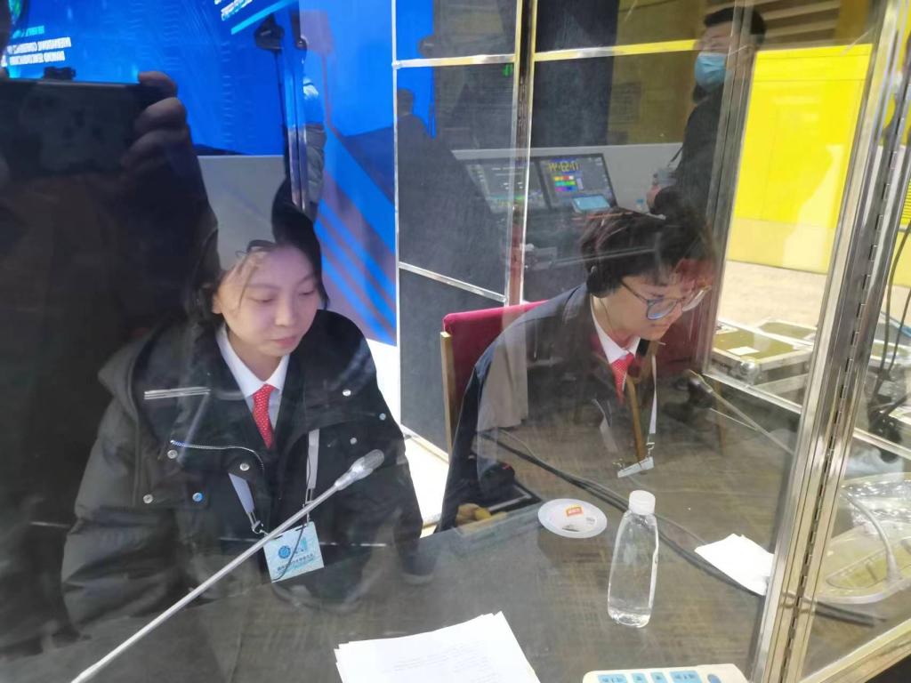 2023年12月12日上午太阳成集团tyc33455cc2021级翻译专业1班郭毅翔和2班于倩文同学前往在郑东新区郑州国际会展中心举行的第一届金刚石半导体大会观摩实习同声传译。
