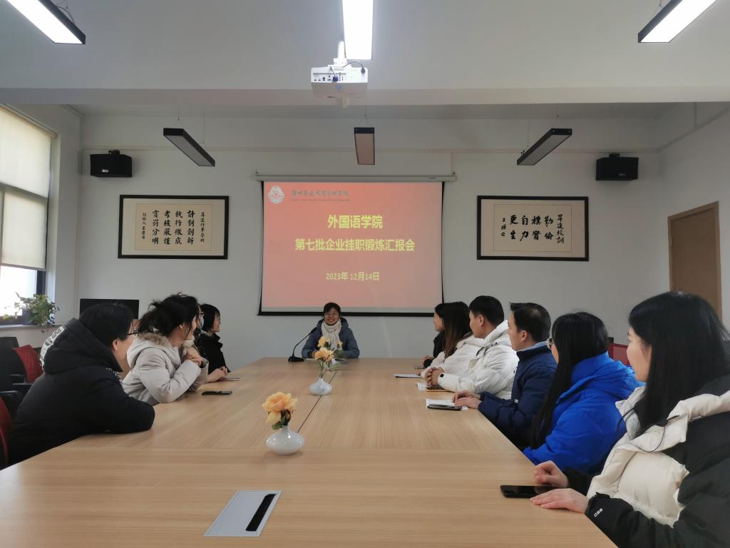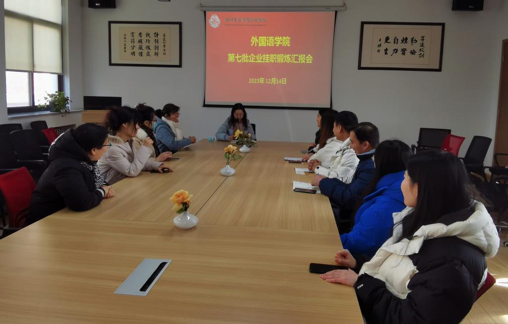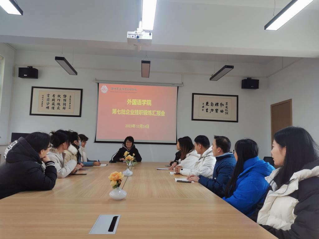 2023年12月14日下午,太阳成集团tyc33455cc在会议室召开了第七批教师到企业挂职锻炼汇报会,进行汇报的老师分别是来自于商务英语教研室的张小红老师、翻译教研室的惠凯赟老师和孙燕冉老师,他们分享了自己在企业挂职的过程、心得和收获。