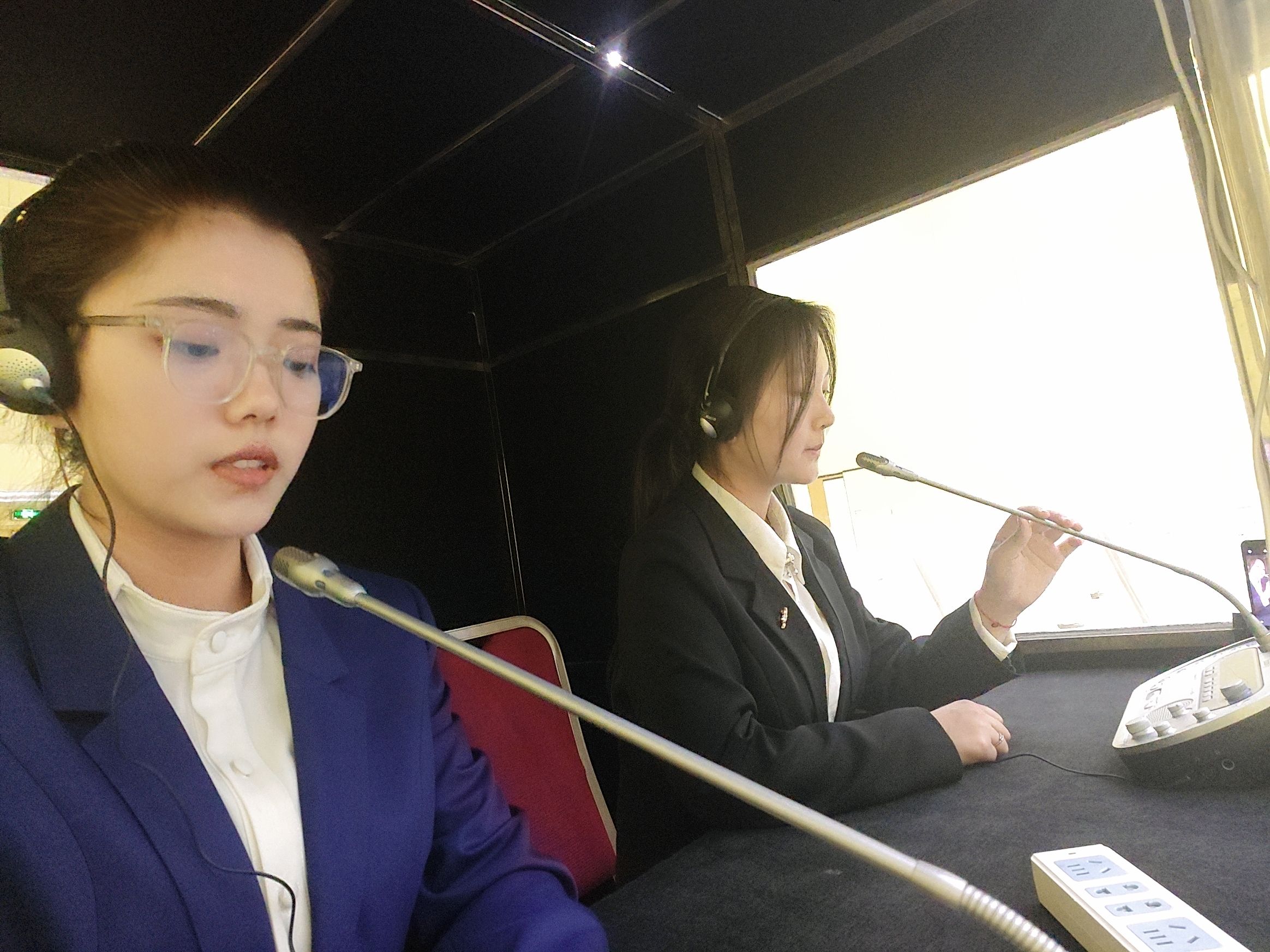 大会开始前,两位同学积极配合场内工作人员进行同声传译接收机发放工作。大会中,她们观摩了口译员进行交传和同传的全过程。大会结束后,她们回收同声传译接收器,并和与会嘉宾用流利的英语进行沟通。