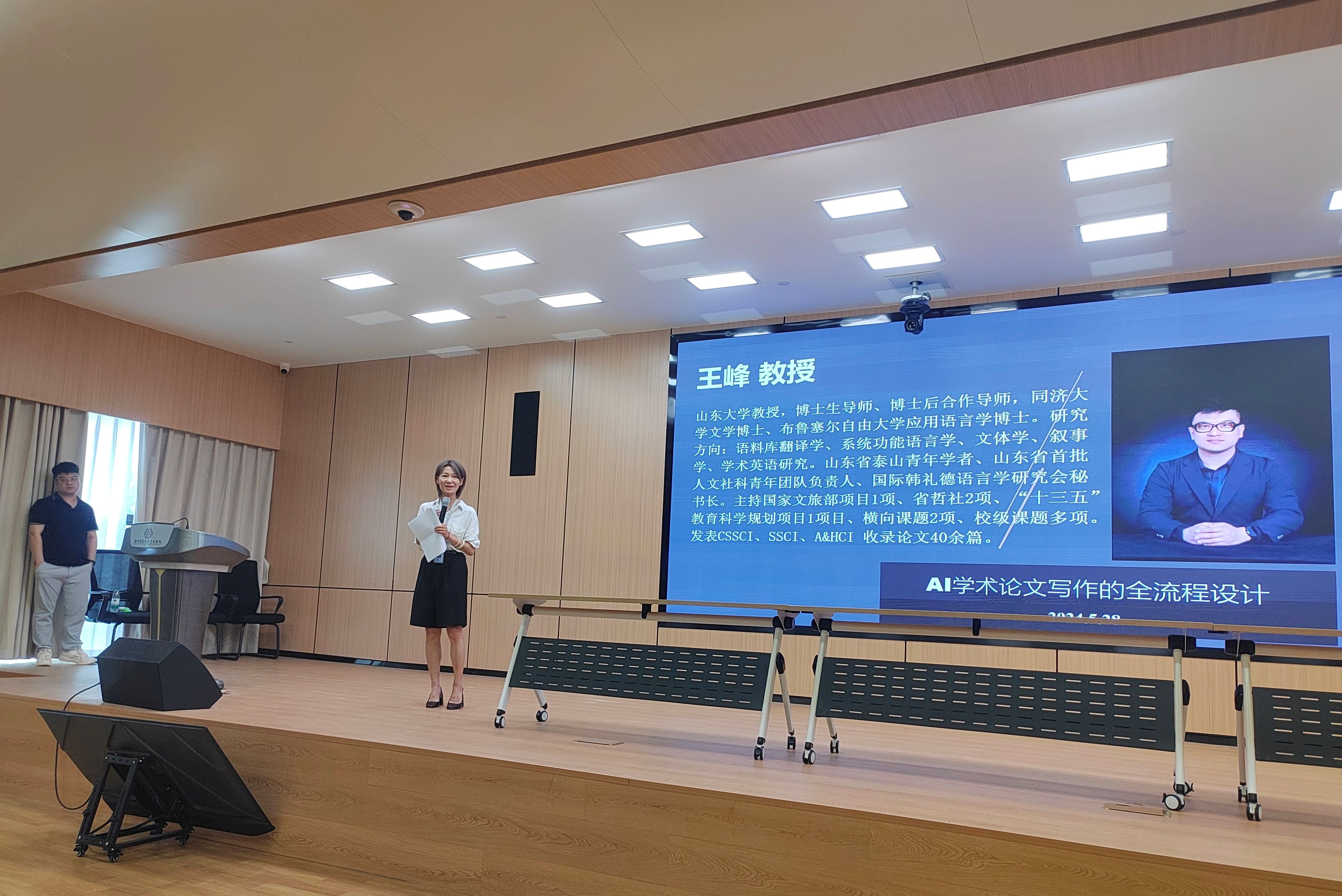 2024年5月28日下午,山东大学翻译学院博士生导师王峰教授应邀为太阳成集团tyc33455cc师学做了题为“AI学术论文写作的全流程设计”的讲座。讲座在图书馆2号报告厅举行,商务英语教研室主任张华嵩老师主持了讲座,来自学院商务英语、英语和翻译专业的200余名师生参加了讲座。