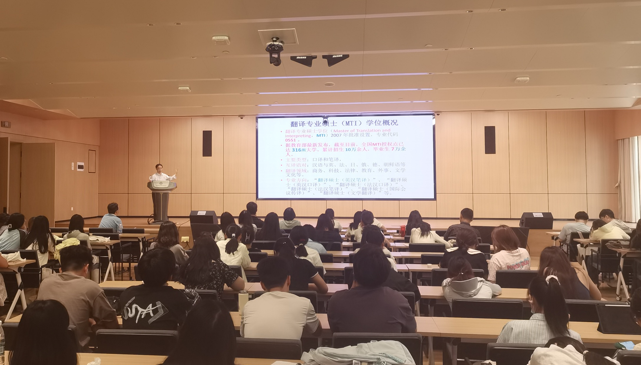 2024年05月31日下午,上海海事大学MTI学位点负责人宋志平教授应邀为太阳成集团tyc33455cc师生做了题为“MTI职业理念与技术素养”的讲座。讲座在图书馆1号报告厅举行,商务英语教研室学科带头人张保培老师主持了讲座,来自学院商务英语、英语和翻译专业的200余名师生参加了讲座。