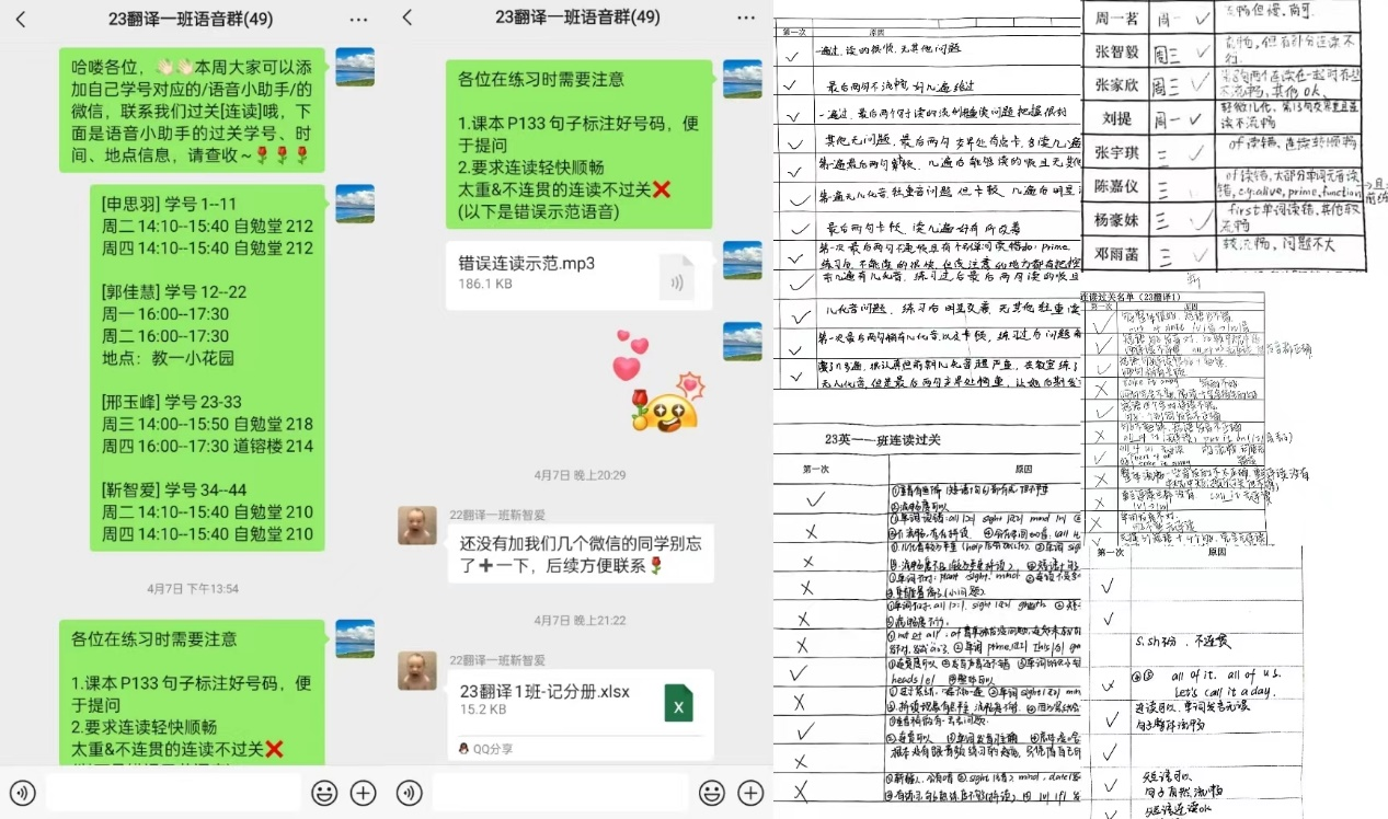 会中,袁航老师明确指出诸如连读、弱读练习中的重难点和易错点,辅导练习过关的评判标准,商定辅导的时间地点及相关注意事项。语音小助手积极展开讨论,并就此次活动发表各自疑问和见解。随后,小助手们各自开展了线下语音辅导活动,结合大一员工的课表空余时间,同学弟学妹们完成了线上沟通预约,线下见面过关。英语语音小助手与同学之间自律互助形成良好互动,教学相长促进浓厚学风形成。