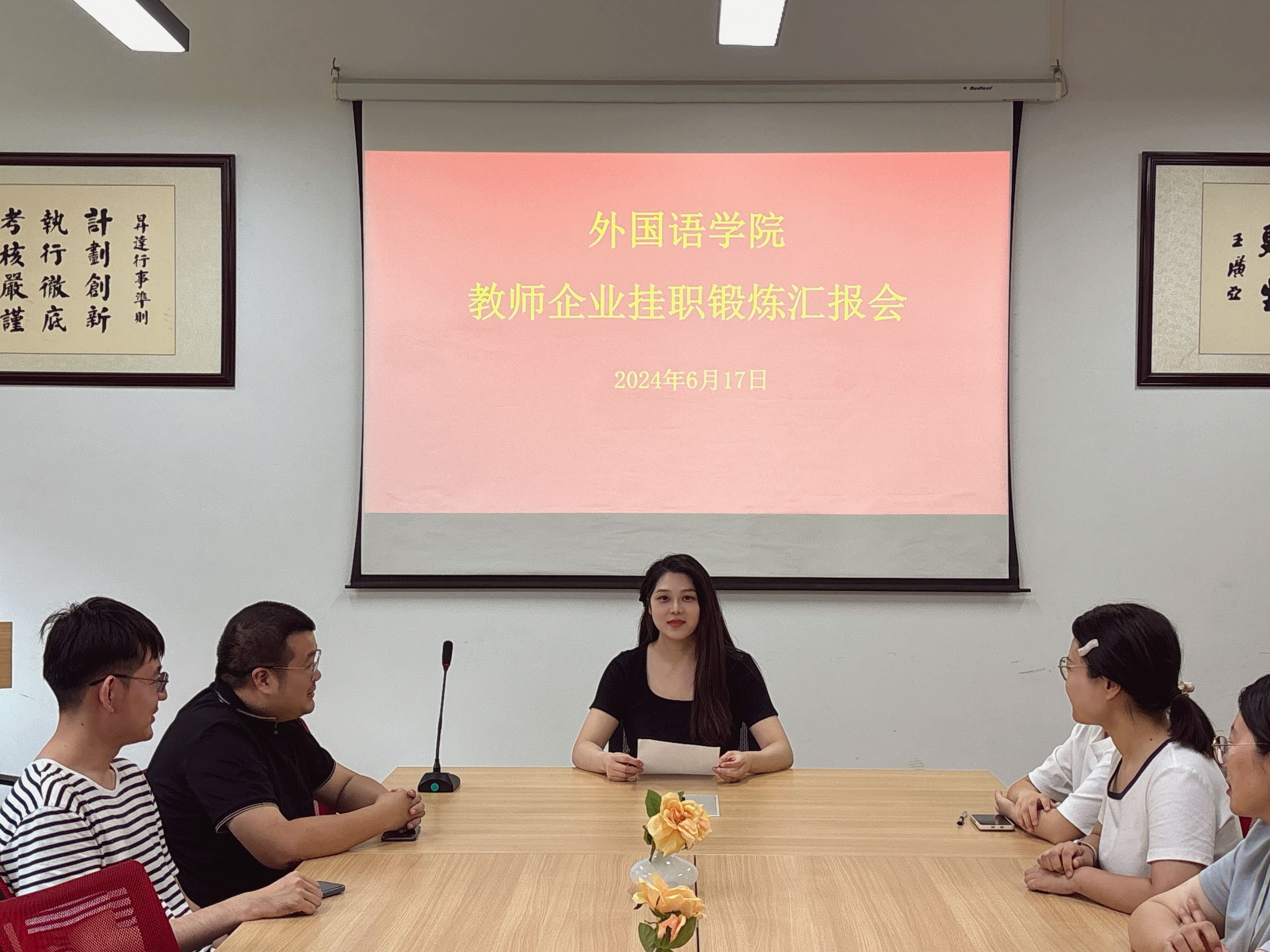 2024年6月17日,在太阳成集团tyc33455cc会议室召开第八批教师到企业挂职锻炼汇报会,本次挂职老师为英语教研室周凯旋老师,她分享了自己在企业挂职的收获。