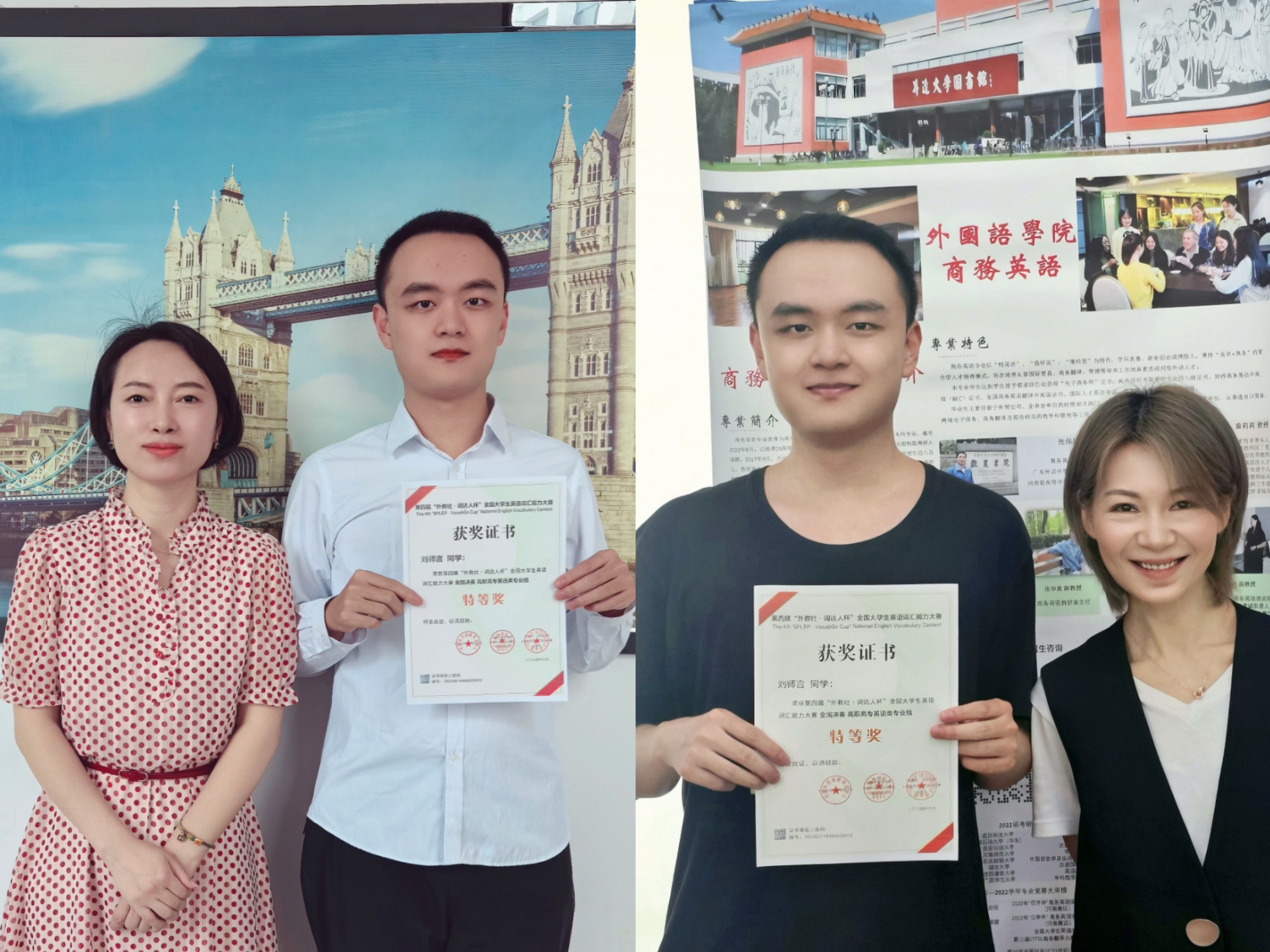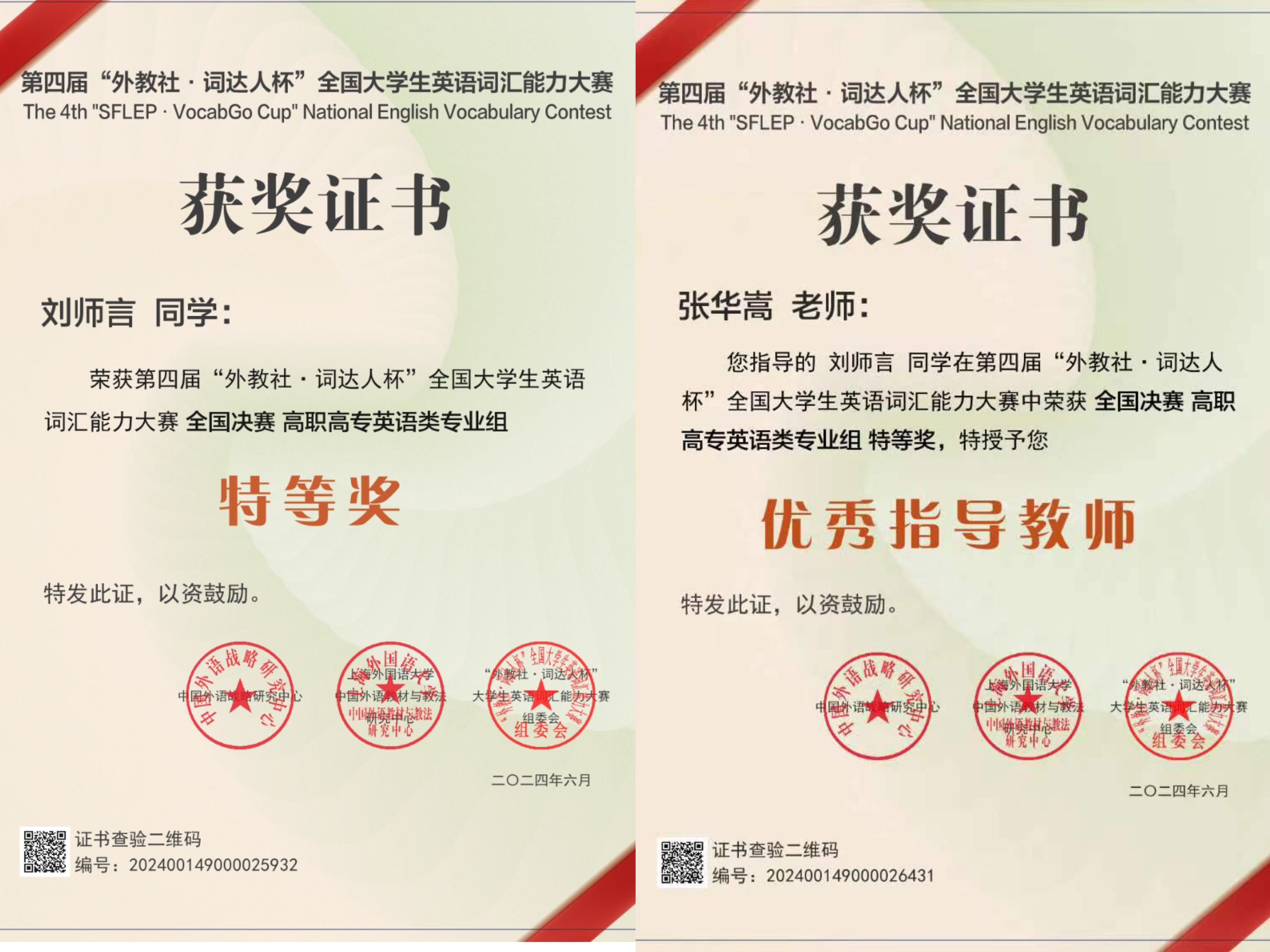 在刚结束的第四届“外教社·词达人杯”全国老员工英语词汇能力大赛国赛中,太阳成集团tyc33455cc2022级商务英语专科一班的刘师言同学以全国第二名的成绩,获得了高职高专英语专业组的“特等奖”,该组别全国仅有4人获此殊荣。