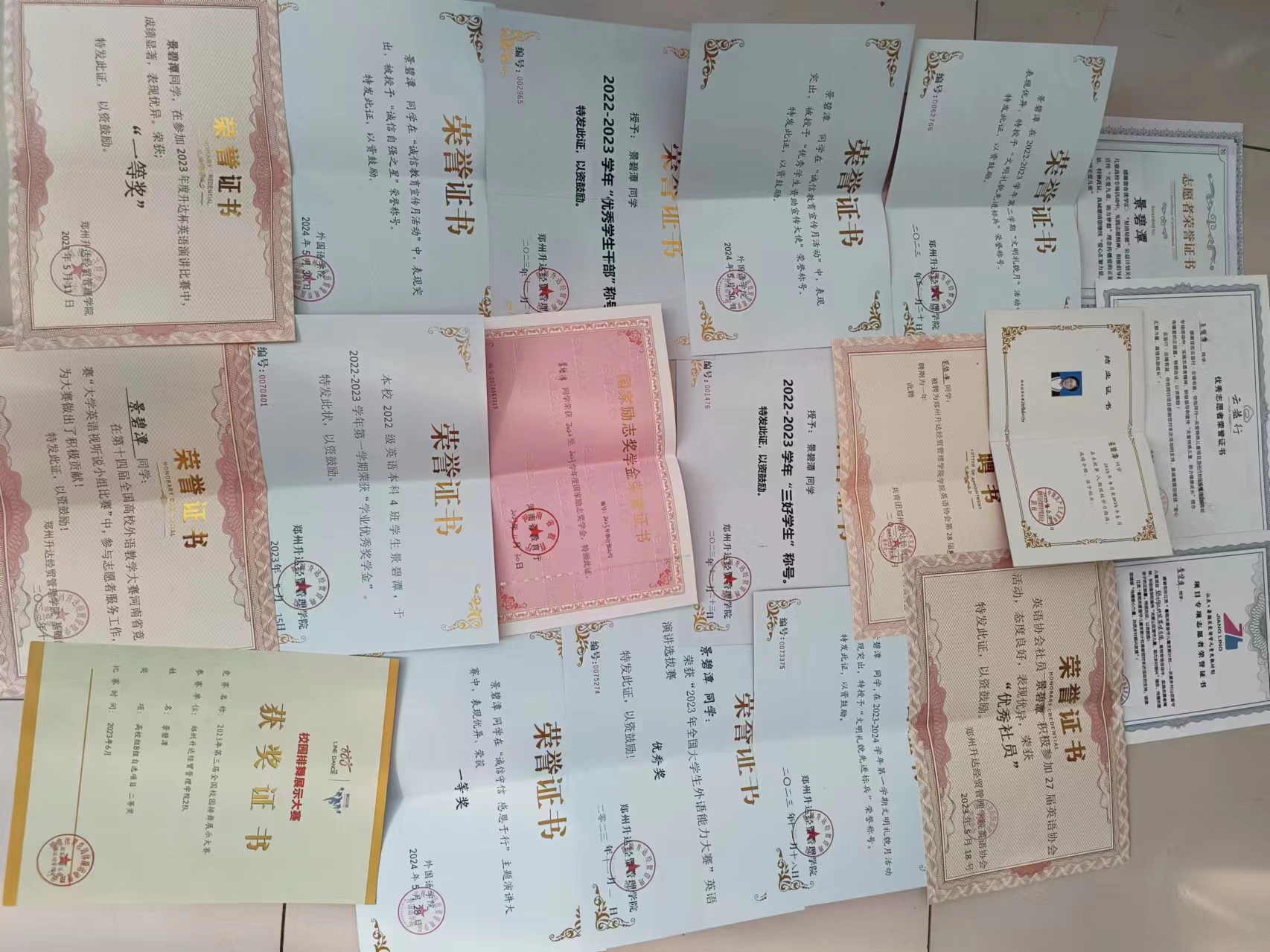 另在大二期间,她仍不断努力,积极进取,获得了“国家励志奖学金”,校级“诚信自强之星”荣誉称号、“优秀员工资助宣传大使”的称号。在“诚信守信 感恩于行”主题演讲比赛中获院级一等奖,在第二届“向上杯”老员工英语阅读能力竞赛(四级能力赛道)中获得优秀奖,在 2024 年第四届全国校园排舞展示大赛获团体一等奖。