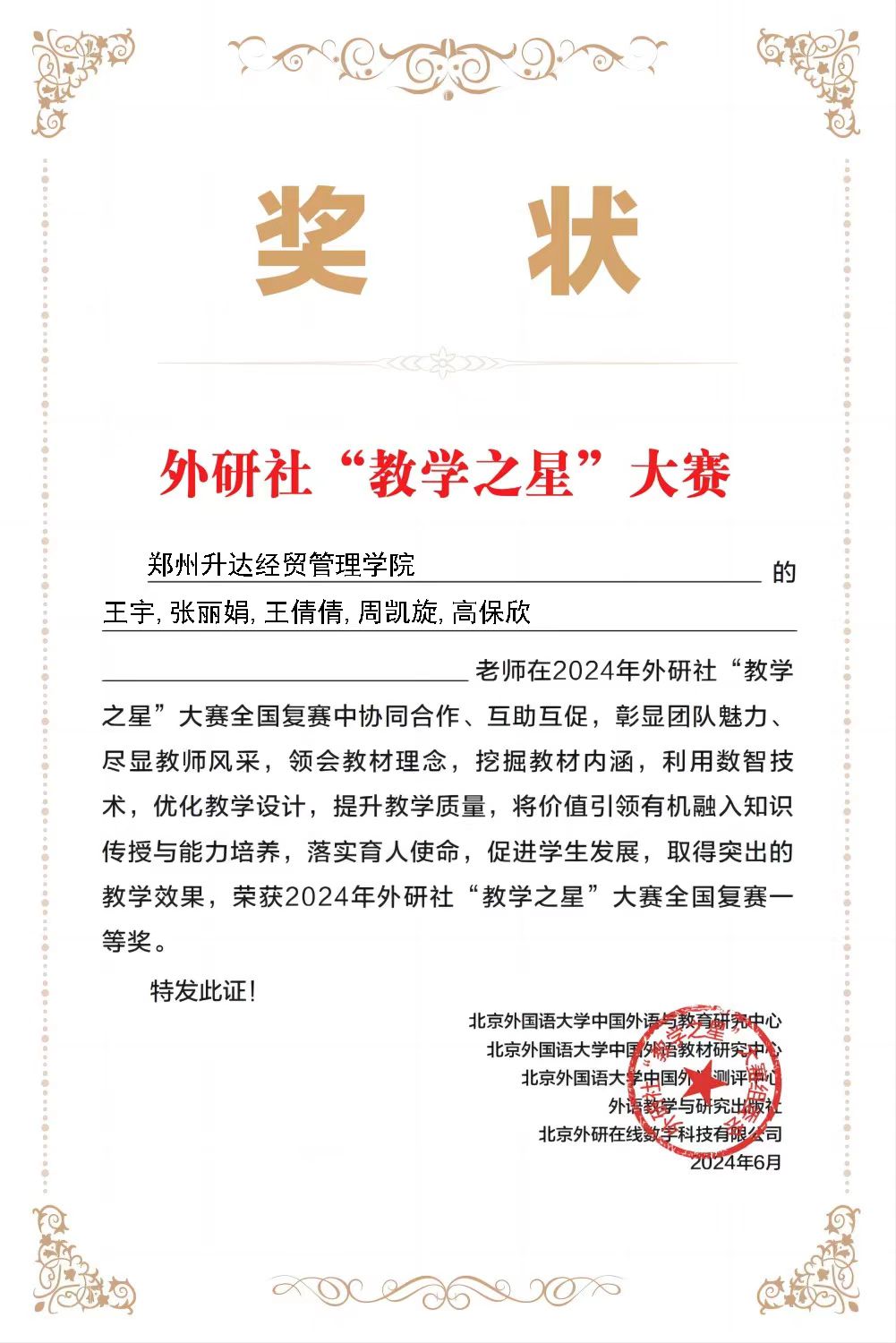 近日,喜讯传来,公司由太阳成集团tyc33455cc英语教研室张丽娟、王宇、王倩倩、周凯旋、高保欣五位教师组成的教学团队,在2024年外研社“教学之星”大赛全国复赛中协同合作、互助互促,将价值引领有机融入知识传授与能力培养,落实育人使命,促进员工发展,取得突出的教学效果,最终荣获2024年外研社“教学之星”大赛全国复赛一等奖。这也是太阳成集团tyc33455cc连续第三年获得该赛事全国一等奖。
