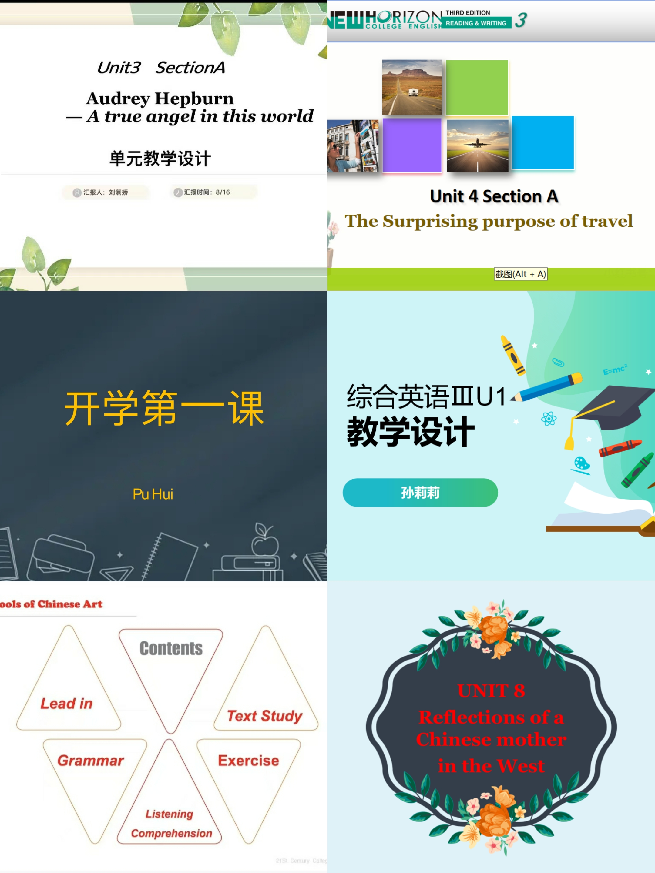 刘澜娇老师汇报的是第三单元教学设计思路,首先是一些课程基本信息的介绍。前两个课时是lead- in和word study,三四课时是text study。最后两课时讲解课后习题。 根据已读促写的教学模式布置写作作业。另外整个教学环节融合了四级题型和思政元素,也尝试着将多媒体技术引入教学设计,充分调动员工的课堂参与度和积极性。