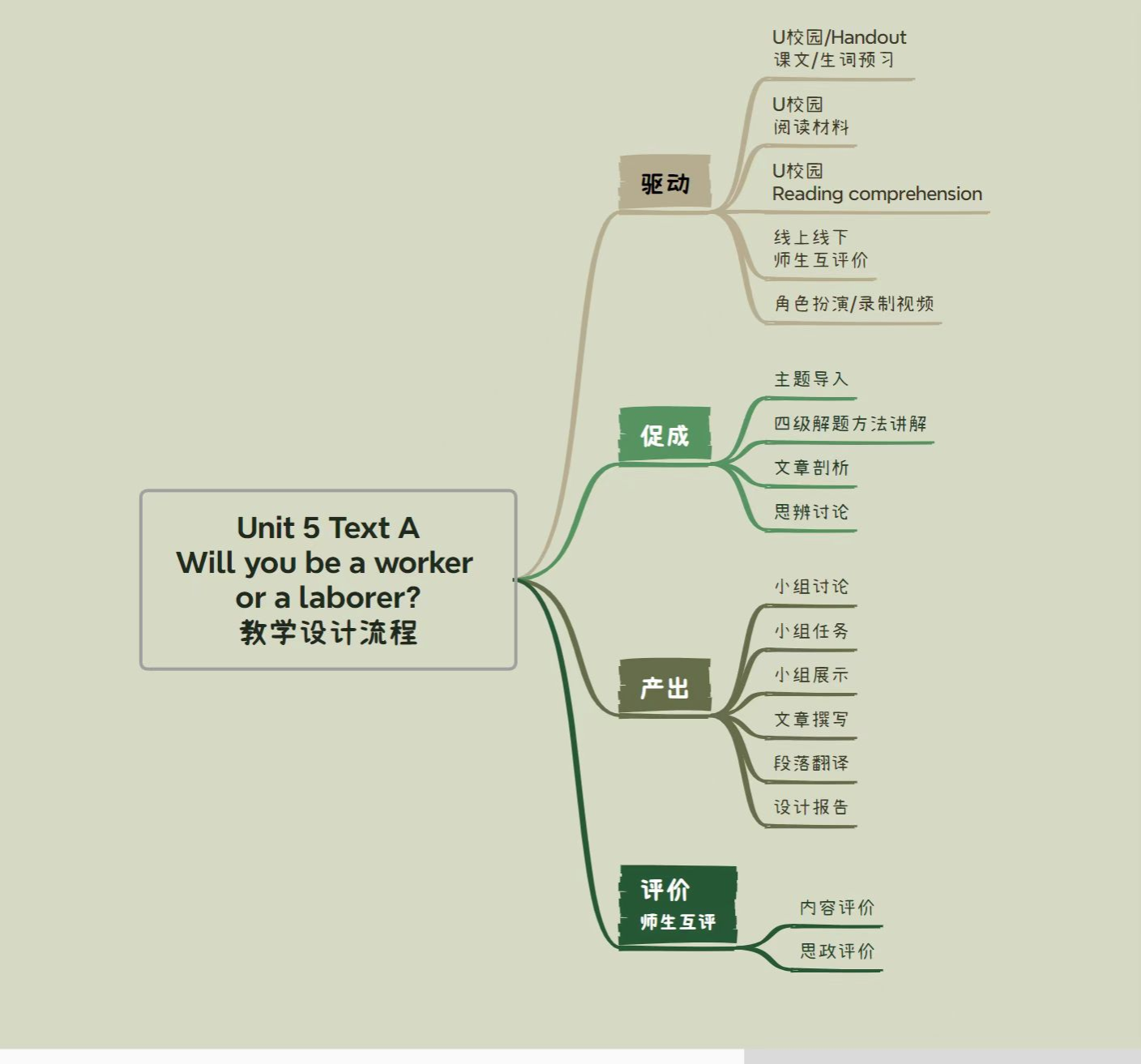 赵梦真老师使用思维导图向大家展示了第五单元的教学设计整体思路,以“产出导向法”的教学理念进行读写教学的促成实践。在英语读写教学的促成环节,设计多种多样的小组课堂活动促成阅读输入材料向写作产出成果的有效转化,提升员工的读写技能。