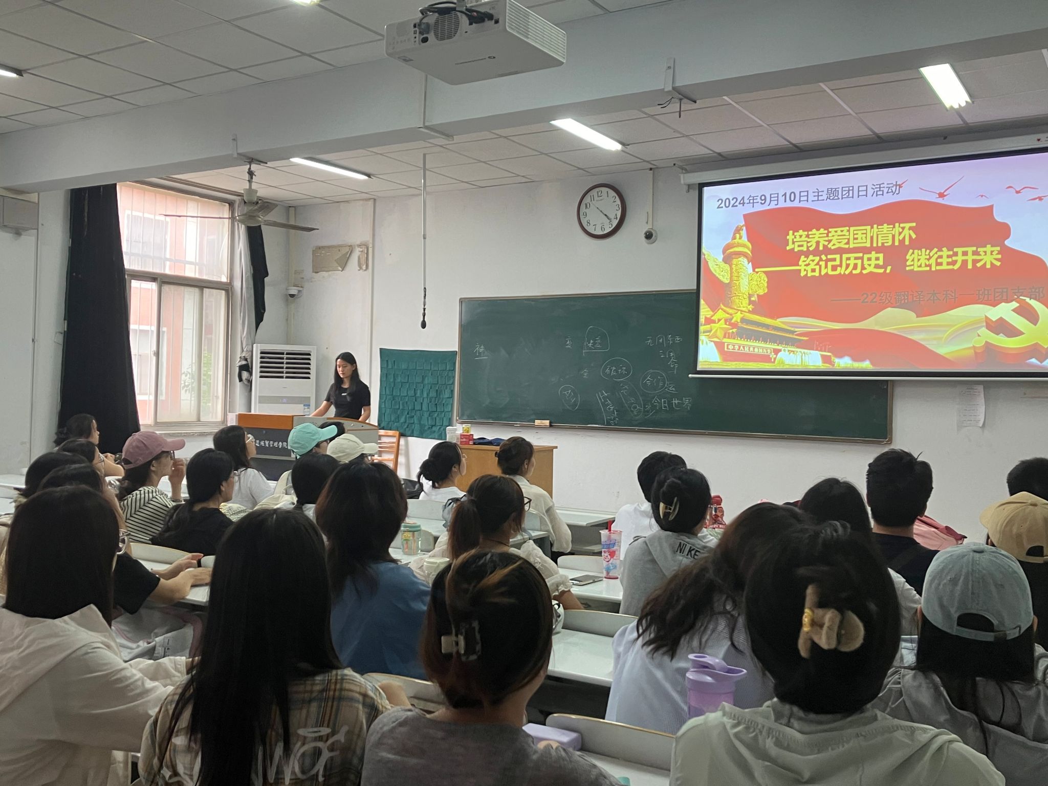 为鼓励团员积极向上,追求卓越,2022级翻译本科1班团支部于2024年9月10日在综合楼209教室积极组织开展了“培养爱国情怀——铭记历史 继往开来”的主题团日活动。本次活动通过主题演讲和PPT讲解互动的形式开展,会后复盘总结并邀请团员代表分享心得,激励大家坚定青春信仰。