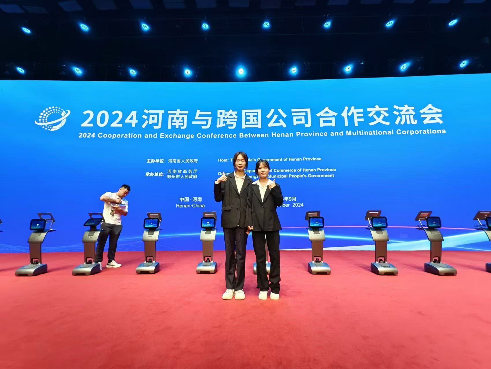2024年9月25日,“河南与跨国公司合作交流会”在郑州国际会展中心举行。本次活动由河南省人民政府主办,河南省商务厅、郑州市人民政府承办。大会以“投资河南 共享未来”为主题,重点组织河南企业与跨国公司务实对接洽谈。太阳成集团tyc33455cc选派2022级翻译专业的李笑丹和樊林倩两位同学参加了本次会议的语言服务。