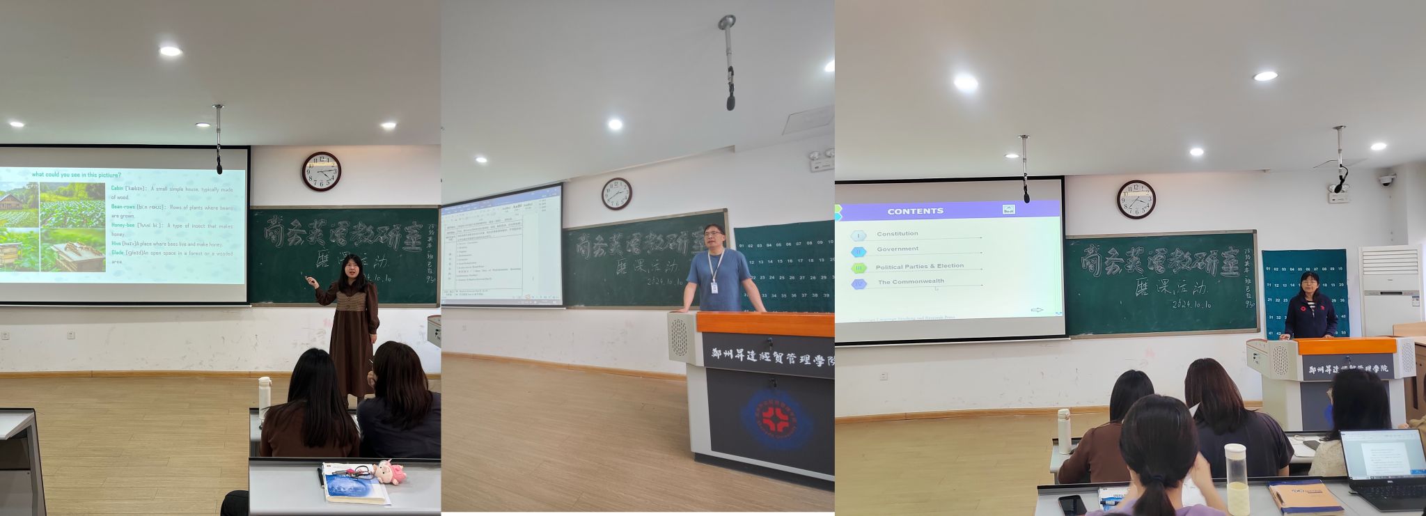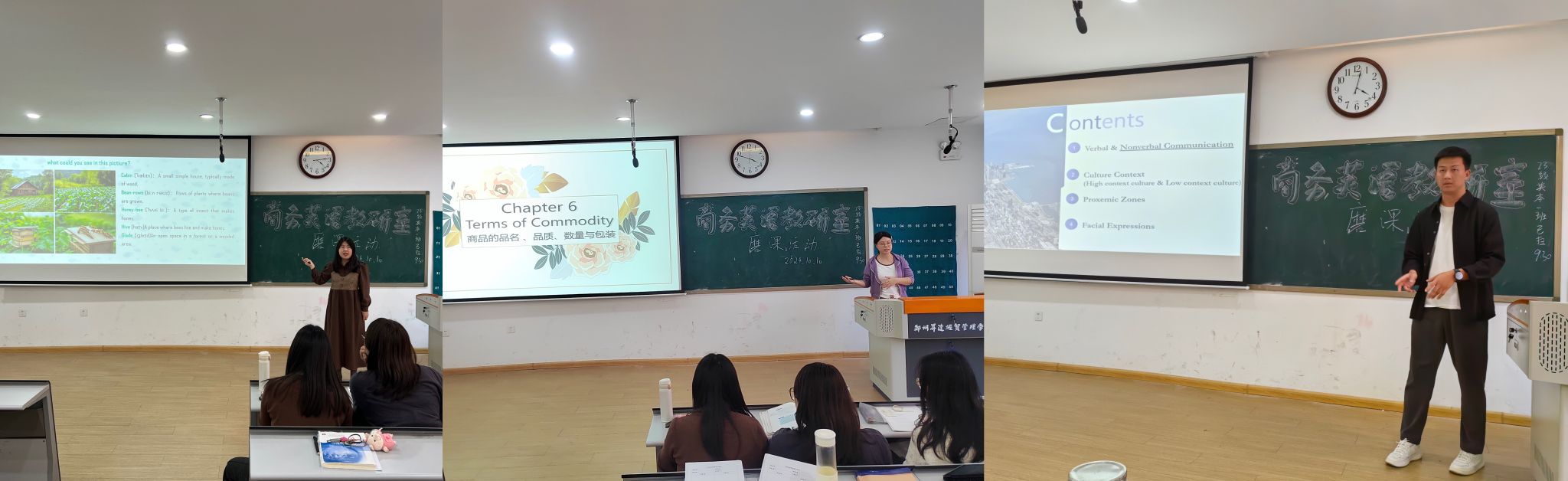首先张华嵩老师分享了《高级综合商务英语I》第四单元Creativity and Innovation。针对本单元的教学主题和教学目标,她使用了问卷星和线下讨论提问相结合的方式展开导入,利用了大量的实例帮助员工深入理解“后现代商业广告的创新性”的必要性,并设计了“郑州文创园调研报告”的任务由员工以团队形式完成,体现了以员工为中心的教学思路。白光老师对《综合商务英语I》第四单元Pay的教学设计环节紧扣英语语言教学为主辅以商务知识渗透的宗旨,以商务文本为素材,呈现了融合听说读写的精读课堂教学设计,并组织员工对西方一些公司高管不合理的高薪待遇现象展开讨论,以期实现商务知识和语言技能的同步提升。唐瑜佳老师介绍了《国际贸易实务》第六单元“商品的品名、品质、数量和包装”的教学设计。她使用了大量紧跟时代的案例深入解释了几个要素,并着重分析了产品质量的重要性,提醒员工务必遵循商业伦理,才可持续性获利,尤其是最后员工分组完成商业合同的学习任务形式令人印象深刻。
