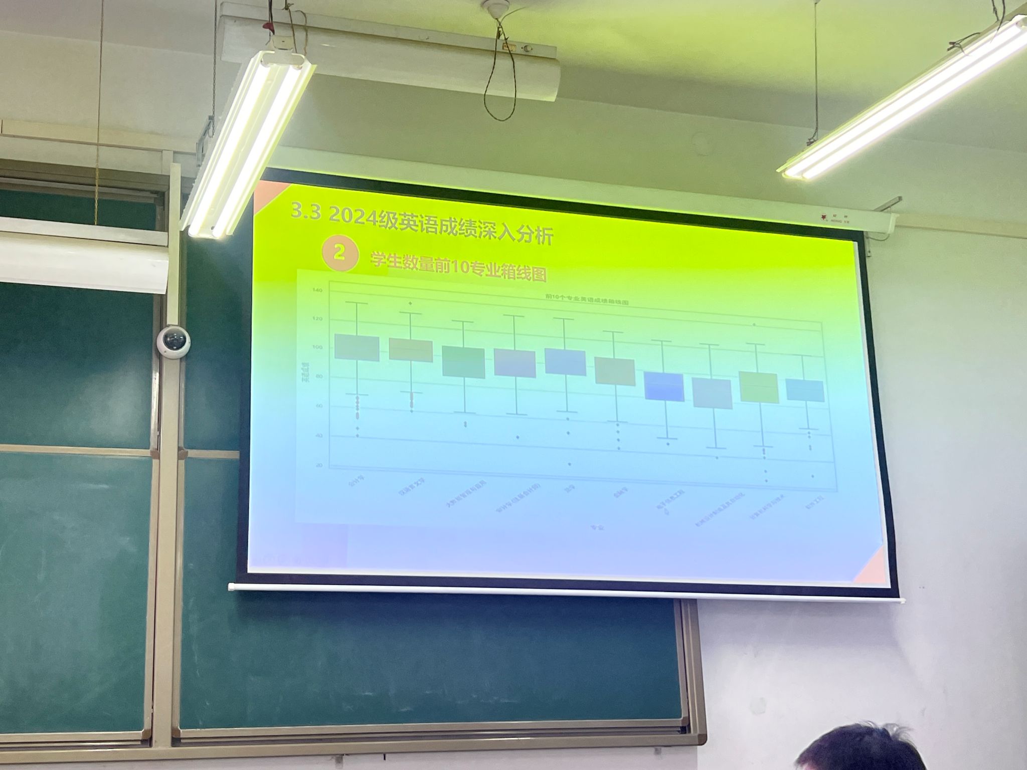 而后赵阳老师对于此次数据收集方法作了介绍,如整体对比及成绩分布对比分析等。其中,员工数量前10专业箱线图为各位老师提供了24级各个学院直观数据对比。