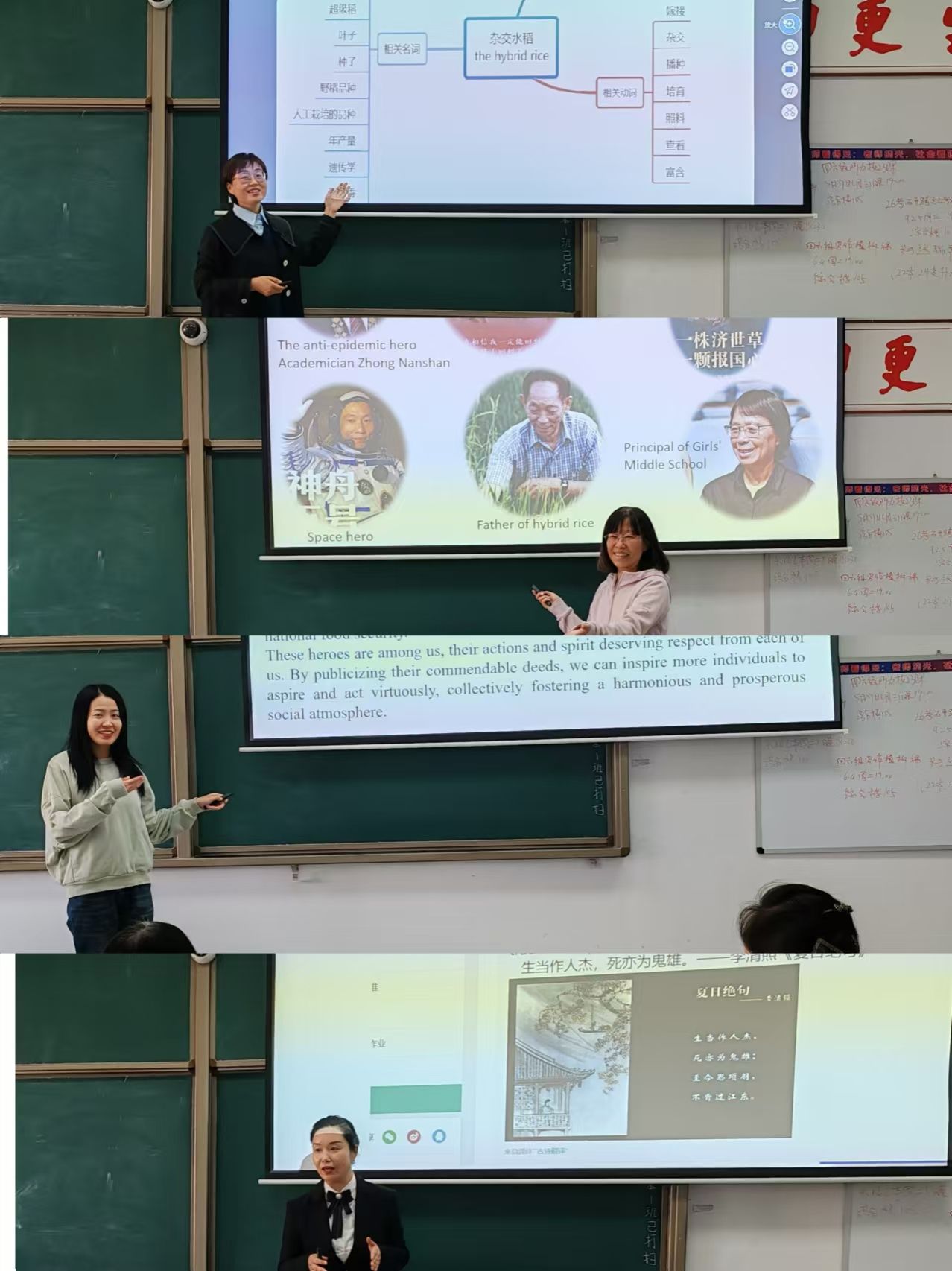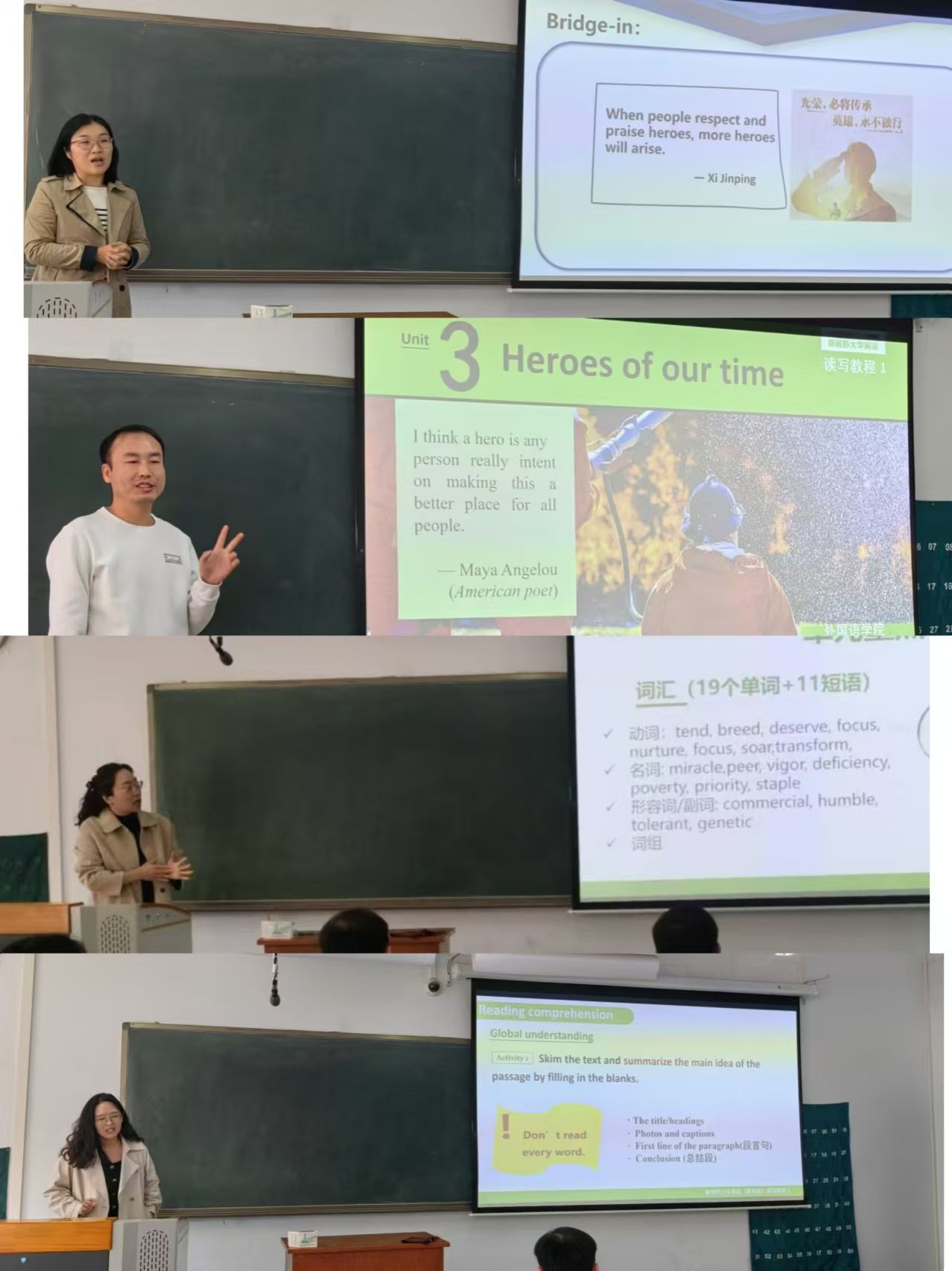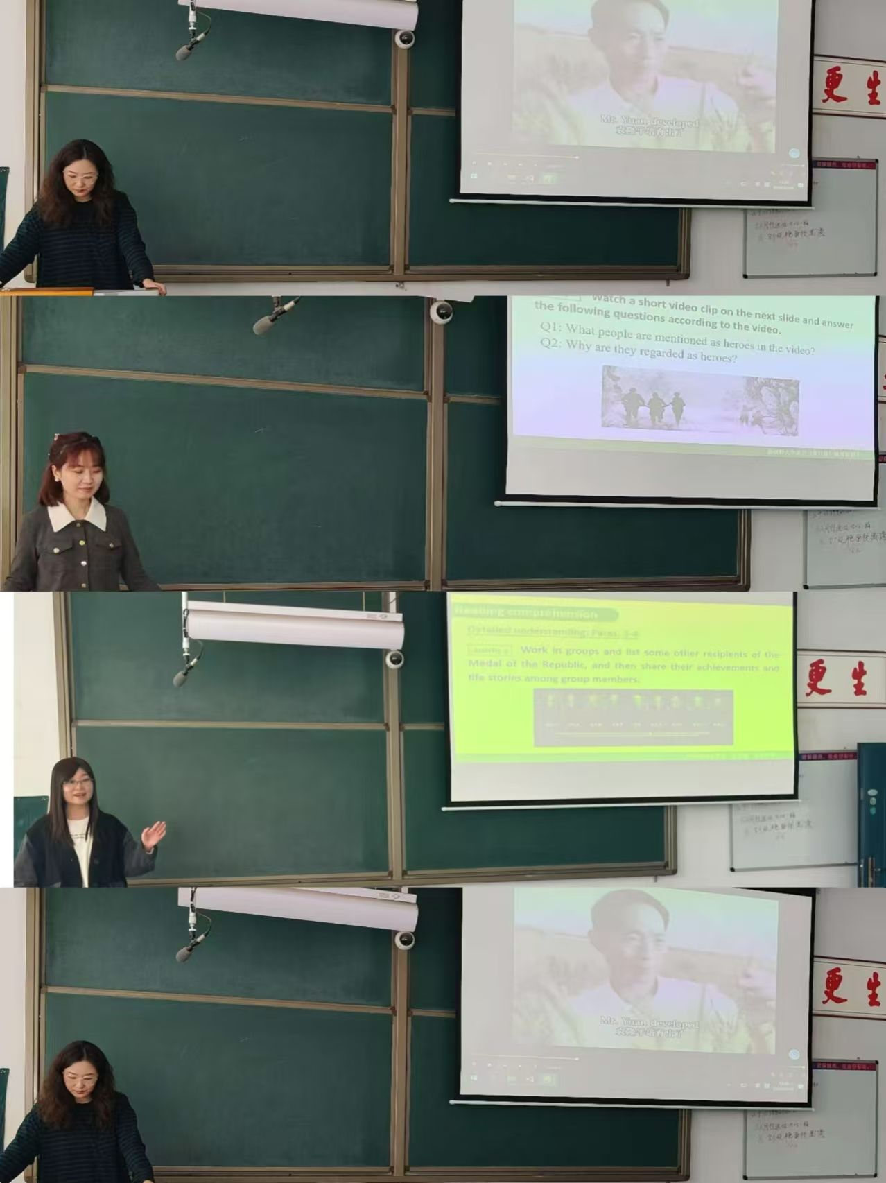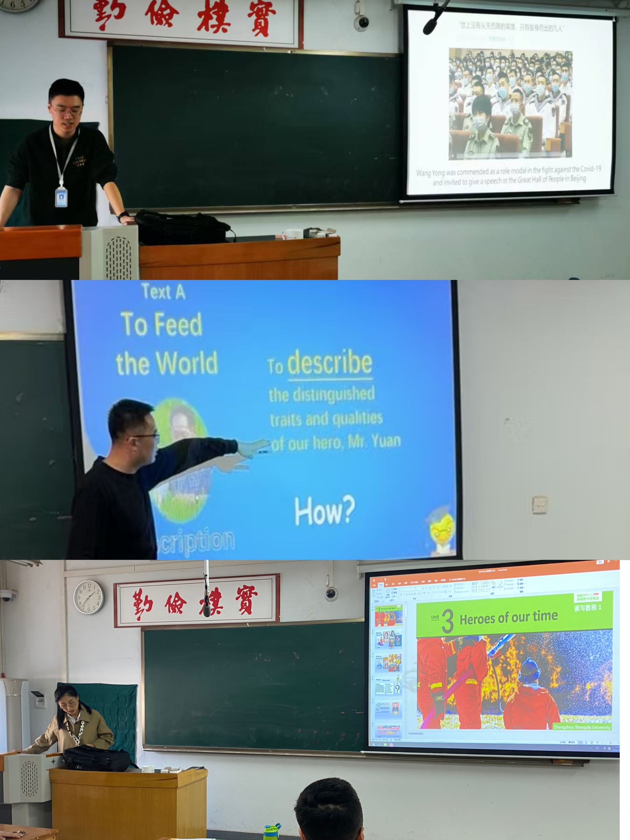 第四组由李璐副教授组织,张培丽、范丽颖和单莹四位老师在综合楼328教师开展磨课活动。几位老师各具特色,亮点突出,单莹老师的导入环节从共和国勋章的获得者引出文章的英雄人物袁隆平,从思政角度循循善诱,引发同学们对英雄一词的理解,效果显著。