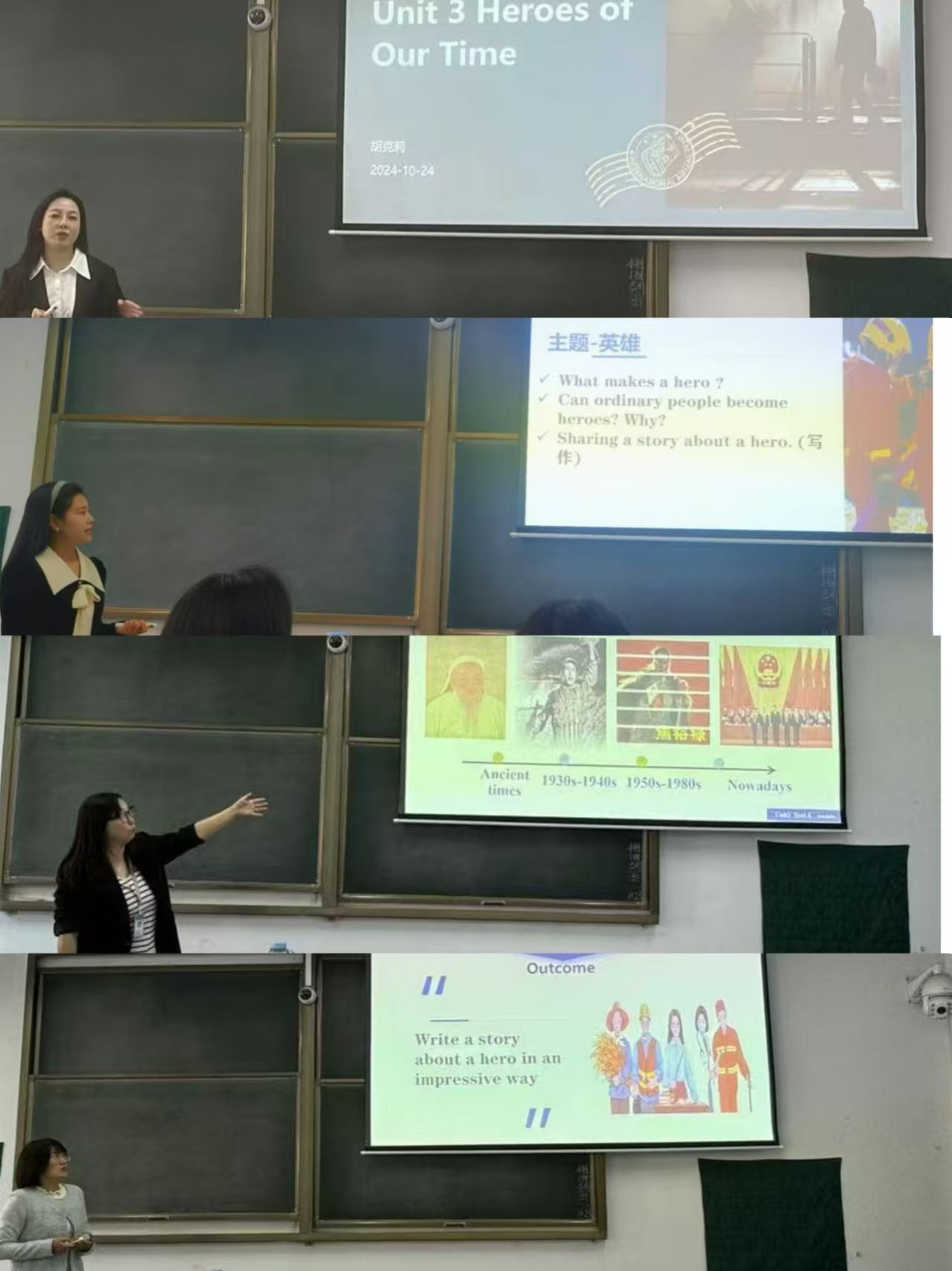 第二组在组长朱明元老师的组织下,张逸洋,陈龙,王彩丽老师在自勉堂108对第3单元(Heroes of our time)的教学内容和教学设计进行了教学展示。在导入环节,朱老师围绕hero的定义展开,引经据典,从哲学角度探讨了“平凡的伟大”与“伟大的平凡“这一哲学命题,高屋建瓴。