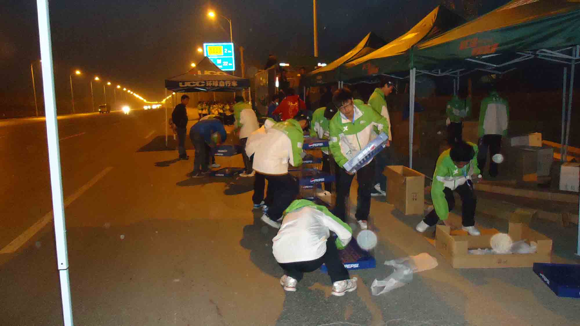 4月8日凌晨3点,60名志愿者在公司们口集合完毕,在系青年志愿者协会的统一安排组织下乘车来到了郑开大道指定地点处。在领取了物资经过了短暂的休整之后,志愿者就投入到紧张的准备工作中。