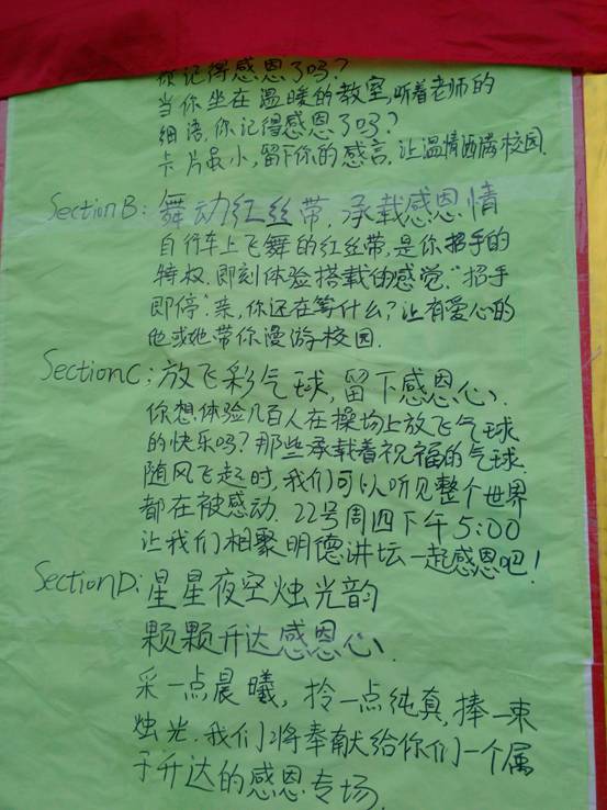 感恩周——感恩师长的教育,感恩同学的友情,感恩花草树木,感恩我们身边的一切。