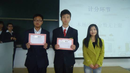 比赛伊始,主持人李文丹,赵梦鸽介绍比赛规则。比赛第一项:全体肃立,奏中华人民共和国国歌,接着选手们依次进入抢答题环节,填空题环节,互动环节,论述环节。期间,各班代表积极发言,亲友团更是各抒己见。现场气氛十分活跃。最后,记分员统计各组成绩。紧接着,团副张杉杉,张九营发表讲话,他们对选手的积极积极表现给予充分肯定,同时也鼓励大家在学习之余多参加一些活动,定能从中受益。比赛结果揭晓:商英二班荣获一等奖,商英一班获得二等奖,日语班获三等奖,英本四班获最佳组织奖。最后,由嘉宾颁奖,并与获奖团队合影留念。