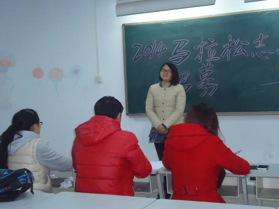 时值春季,全世界共同助跑马拉松,为了更好的服务于这项世界性的比赛,更好的展现学院风采,外语系青志协为选出一批高素质高水平的志愿者。于外语楼举行了一场志愿者招募面试工作,近百名志愿者于2014年3月13日晚6:30准时参加。活动评委有原青志协部长王琼,团委副书记闵慧敏等担任。