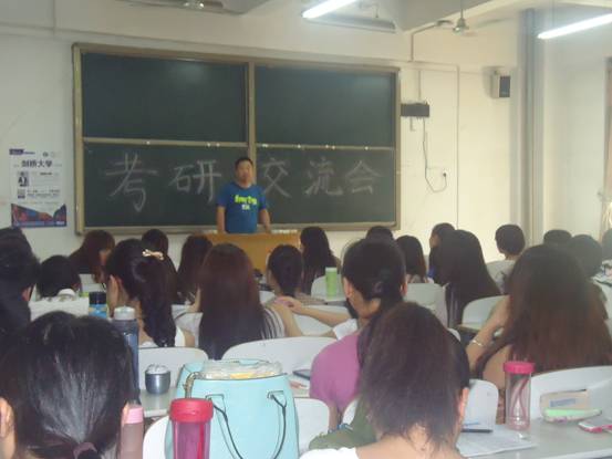 交流会尚未开始,便有许多同学早早到场等候,不一会儿,101教室和日本文化室便都座无虚席,在主持人宣布交流会开始后,被香港理工大学录取的黄欣、被暨南大学录取的陆俊梅学姐等一一上台和同学分享考研经验,整个过程互动不断,同学们的每一个提问都得到了学姐们的耐心回答,学姐还积极提供、分享自己的考研书籍,在一片欢声与掌声中,考研交流会有条不紊地进行着,在将近两个多小时的交流中,学姐为那些有考研意向的同学,做了分析指导,最后,在同学们热火朝天的讨论声中,考研交流会落下了帷幕。