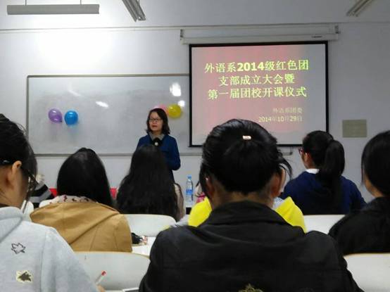 2014年10月29日晚上7点,由外语系团委组织部承办的外语系2014级红色团支部成立大会暨第一届团校开课仪式在道镕楼520隆重举行,外语系行政秘书兼团委书记惠凯赟老师,团委副书记师欣,程聪,团校常务副董事长思政部部长雷茹月出席了本次开课仪式。