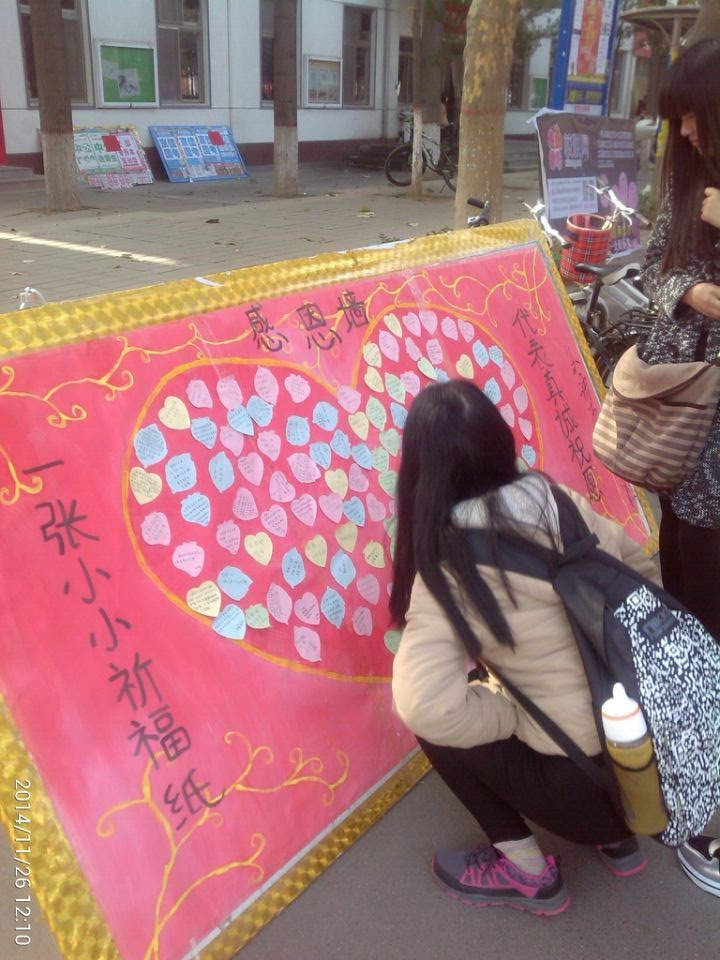 11月24日中午12:00在外语系青志协部长李梦圆的带领下,我系青志协的全体成员在龙湖食府门口集合。正值放学期间,人来人往,志愿者们精心准备了感恩卡片,分发给过往的同学,请大家把要表达的感恩、感激、感谢写下来,传递出去。同门们纷纷在感恩卡片上写上感恩语和祝福语,青志协的同学们将卡片粘贴成心形在展板上展出。而后,青志协的同学将同学们的心意汇总整理下来会交给院广播中心,院广播中心会通过广播在感恩节之际传递同学们的感谢和祝福。