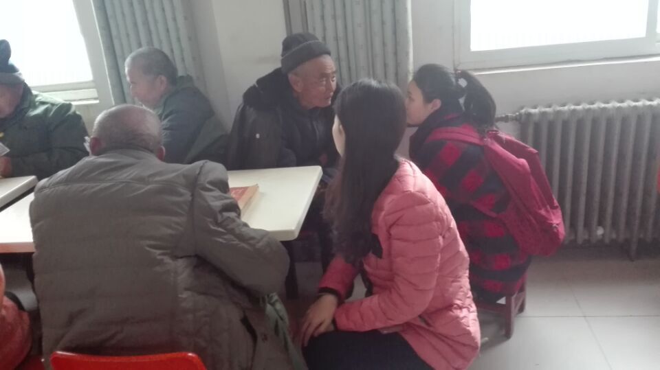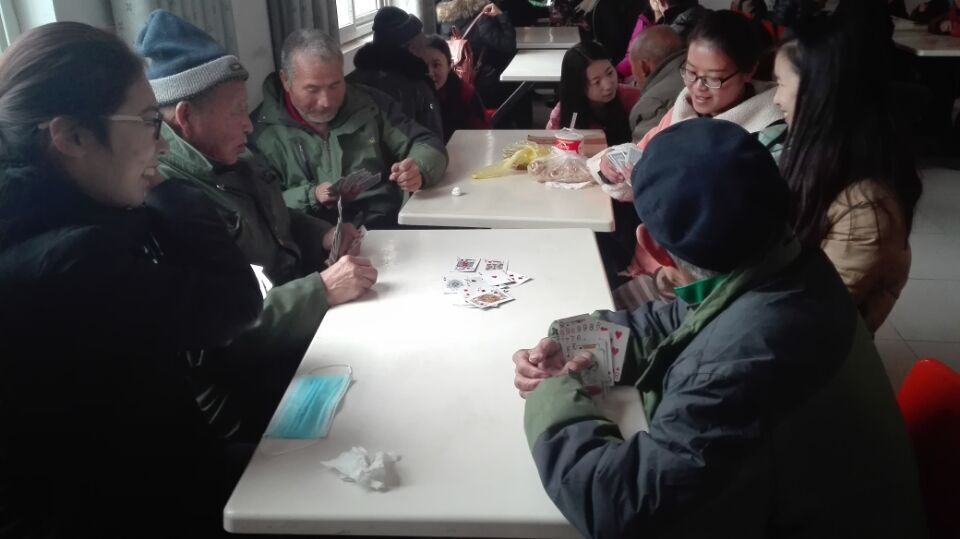 活动当天上午8时,志愿队伍在体育馆门口集合,人员到齐后开始步行出发。8点40分左右,队伍到达敬老院。由于天气寒冷,大家到敬老院老人活动中心进行志愿服务。老人们都很热情,志愿者们与老人们聊聊天、跟着他们学习手工编织,整个房间充满着欢声笑语。老人们喜欢打牌消遣,于是志愿者们分成好几队和老人们“交战”。也有老人给我们的志愿者讲述龙湖镇过去的奇人异事,讲述他们的经历,使志愿者们对龙湖镇有了新的认识。