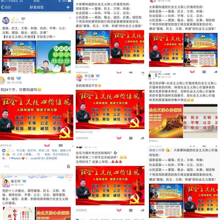 第一、网络宣传。14级小组的同学在网络上刷屏,他们充分利用QQ群、QQ空间、微信朋友圈、微博、贴吧等多种网络形式进行对社会主义核心价值观的宣传和倡导,这对全系乃至全院的同学都起到了一定的影响,促进了校园文明氛围的形成。