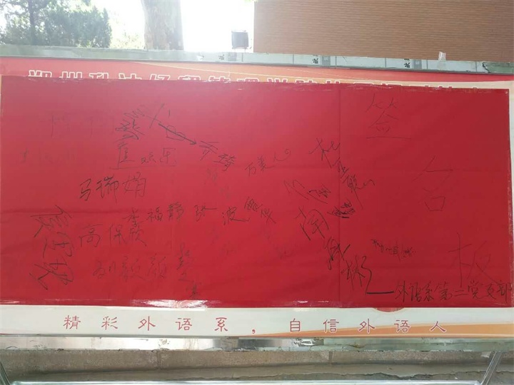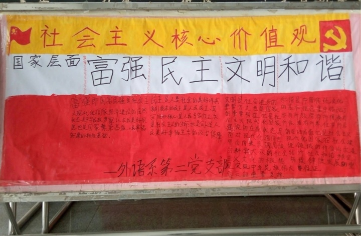 第二、展板宣传。14级全体员工党员及入党积极分子出谋划策,制作出了两份展板,一份是宣传社会主义核心价值观国家层面的内容,一份是让14级全体员工学习过后签字的地方。它们分别放于外语楼与商管楼中间的道路两旁展出,吸引了不少同学驻足观看和学习。