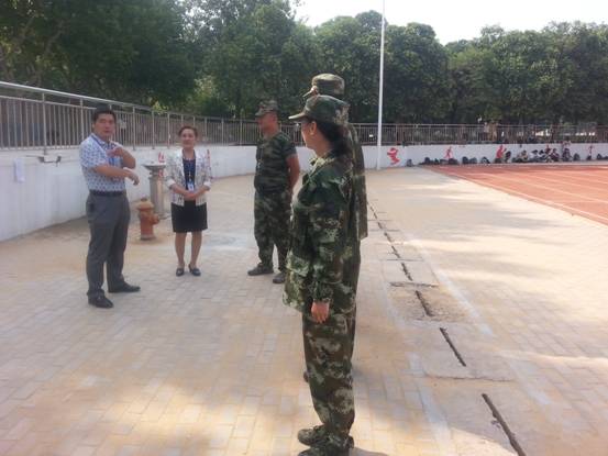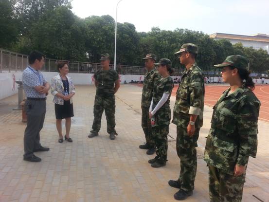 9月18日上午9时许,外语学院经理张梦教授、党总支石皓召书记,在行政秘书惠凯赟以及三位新生班辅导员老师陪同下深入军训场地对教官进行了亲切的慰问。