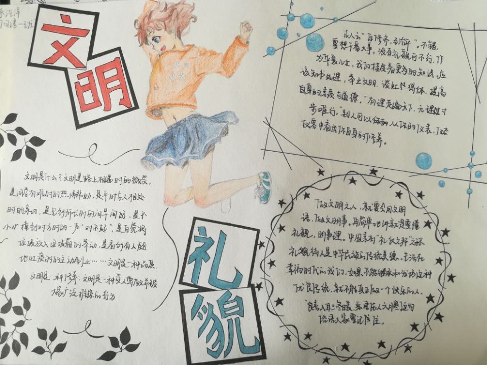 在整个文明礼貌月期间, 2017级的同学们用自己的画笔制作了一张张手抄报,以文明礼貌为主题,用文字、用图画传达了自己对文明的理解。2015、2016级的同学则开展了文明行为随手拍活动,真实的记录了身边的文明行为。