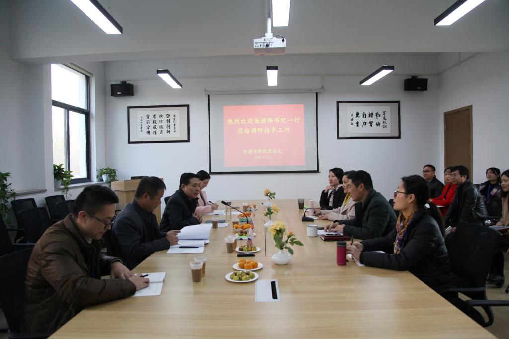 2018年11月23日星期五上午,公司党委张德伟书记、人事处张蕾处长、宣传部长职正路、宣传部潘悦老师一行四人莅临太阳成集团tyc33455cc,调研指导公司基层党建工作情况。公司党总支书记石皓召同志、经理张梦教授、副经理兼总支统战委员崔瑾英副教授及全体总支委员、各党支部书记、全体辅导员参加了此次调研。