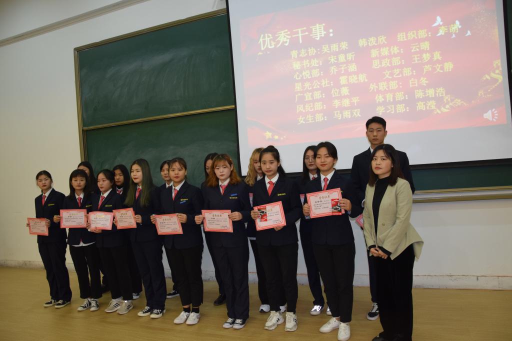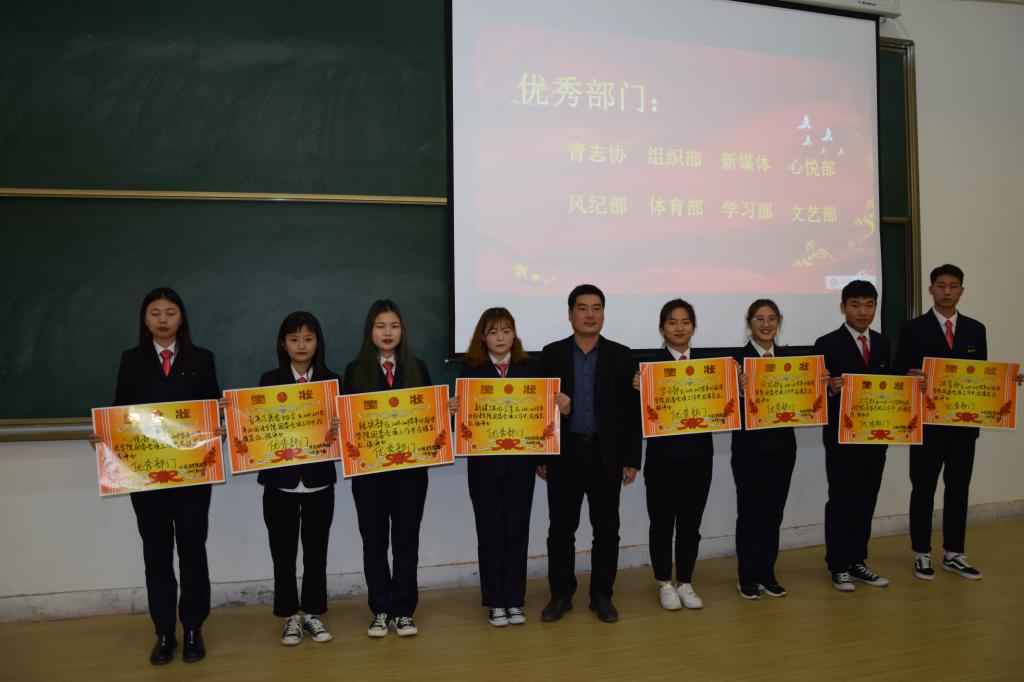 会议伊始,大家同唱中国共青团团歌,接下来表彰了包括吴雨荣在内的16名优秀干事,包括卢淑娟在内的10名优秀部长和包括青年志愿者协会在内的8个优秀部门。石书记、惠老师和赵老师分别为大家颁奖并合影留念。