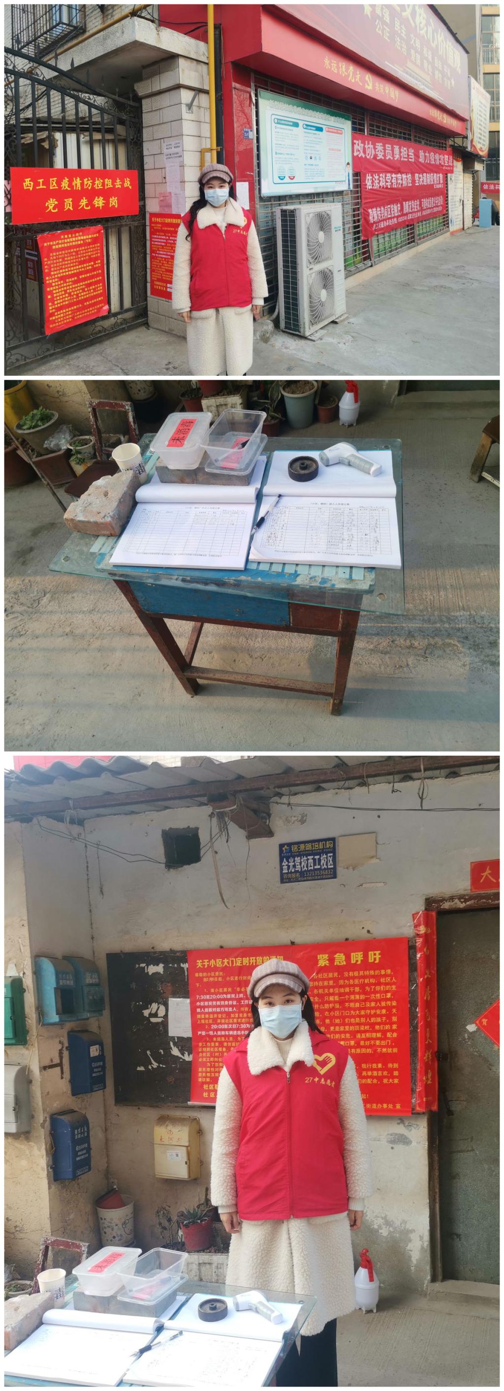 18级商务英语本科三班的王春霖同学,在疫情爆发后,一心想为防控疫情做点事情。在征得家人同意后,报名成为一名志愿者,志愿服务于洛阳市西工区体育场路某小区,积极参与社区门口值班督查、进出人员信息登记和防疫防控知识宣传等工作。本着对每一位居民负责的态度,对每一个辖区内居民进行出行排查和体温测试,进行新型冠状病毒的知识科普,提醒居民戴口罩、勤洗手、注重个人卫生。穿着志愿服装,一张陈旧的小方桌成了她的临时工作台,戴着口罩认真登记信息,为早日结束疫情贡献自己的一份力量。