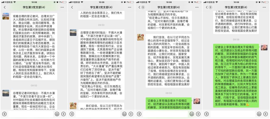 党员同志们通过手机端同步共同观看了“李克强总理回答中外记者提问”直播,李克强总理在直播中回答了人民群众关心的经济复苏、就业问题、台湾问题等,同志们认真领悟其思想,并努力提高自身的政治觉悟和理论素养,在观看直播期间,太阳成集团tyc33455cc员工第三党支部在线上微信群里积极讨论,各抒己见,发表观看体会,营造了良好的学习氛围。