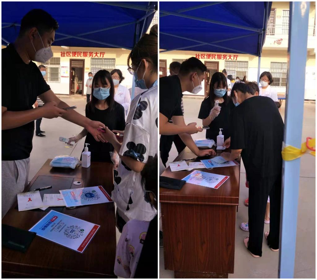 20级英本一班员工蔡行,共青团员,校青年志愿者协会项目部干事。疫情蔓延到了蔡行所在的开封市,8月7日晚上临时接到8月8日全社区全员进行检测核酸的通知,由于社区人数较多,工作人员较少,蔡行在8月7日晚上向社区干部报名志愿协助工作人员完成社区的核酸检测工作。蔡行了解到自己的工作是帮助居民登记信息,检测居民的体温以及现场秩序的维持。在工作的期间,需要引导群众扫码登记,既要解释又要严格管控,引导居民间隔一米的安全距离。社区老人比较多,很多老人都不会用手机扫码登记,蔡行手把手教他们步骤,也有很多老人没有智能手机,蔡行就拿自己的手机帮老人登记信息,并不厌其烦的一遍遍解释和核对。天气很热,口罩和衣服被汗水浸湿了,人流不息,下午两点才吃上第一口饭。吃饭完后继续坚守岗位,天气很热,口罩和衣服被汗水浸湿了,晚上才结束工作。