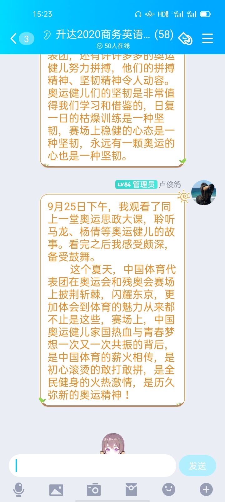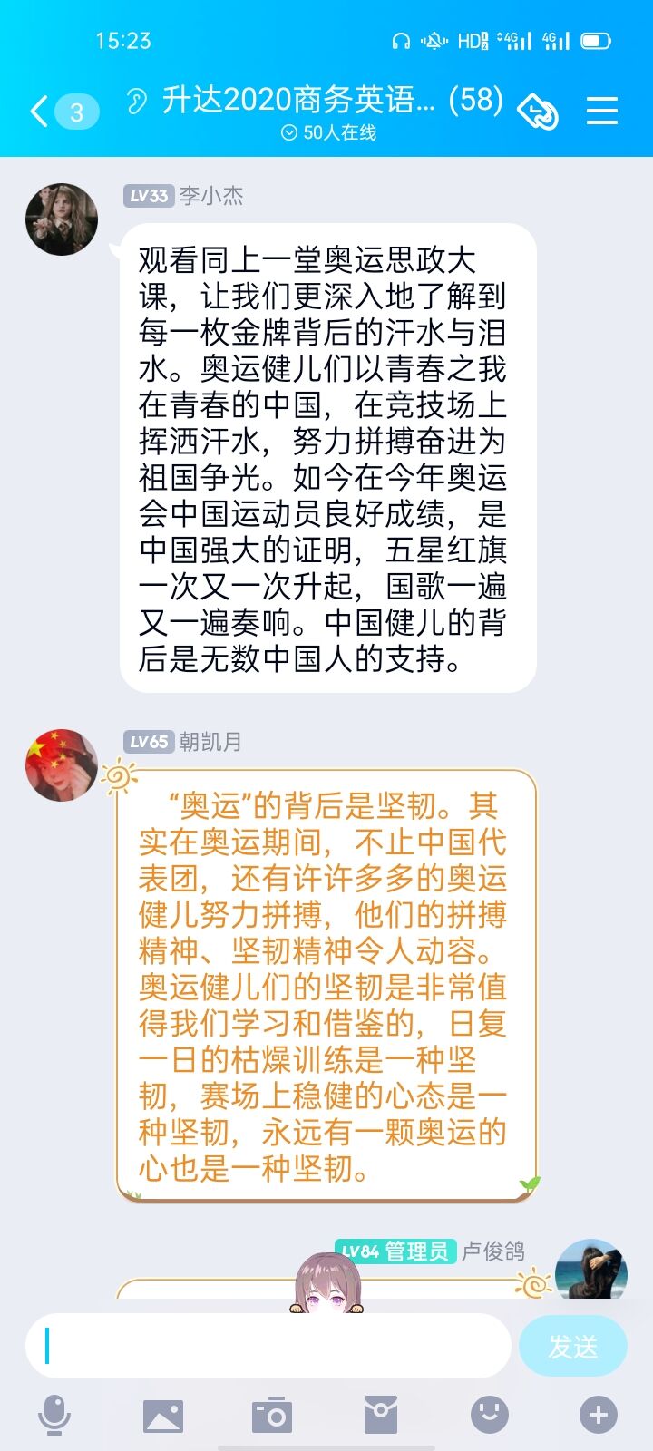 20日语本二班李清芝表示,“奥运”的背后是坚韧。奥运健儿们的坚韧是非常值得党员学习和借鉴的,日复一日的枯燥训练是一种坚韧,赛场上稳健的心态是一种坚韧,永远有一颗奥运的心也是一种坚韧。共产党员作为一支先锋队,需要从奥运中学习到坚韧的品格,从日常的学习工作中做到坚持坚守,在遇到困难挫折时保持坚韧坚守。