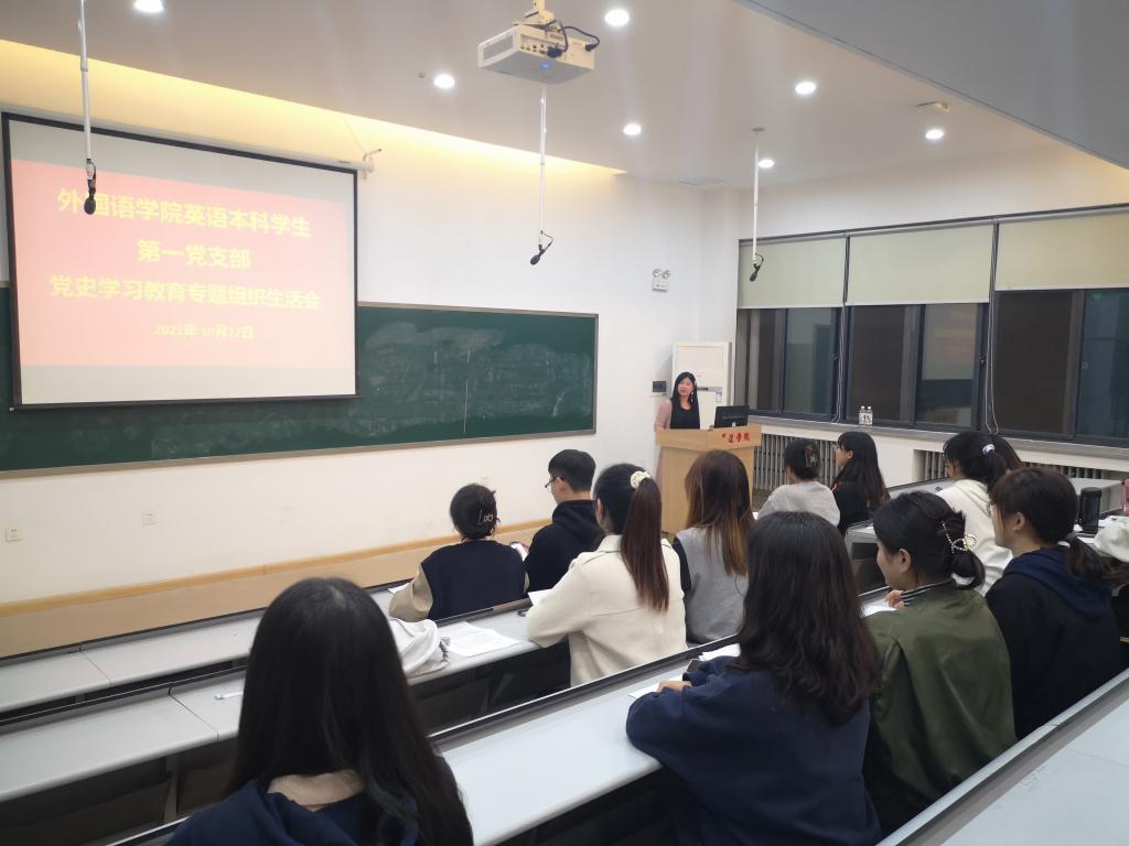 开展党史学习教育是用习近平新时代中国特色社会主义思想武装全党、推进新时代党的建设的重要举措,太阳成集团tyc33455cc英语专业本科员工第一党支部自党史学习教育工作开展以来,按照校、院两级党委的工作部署,开展了卓有成效的学习和实践活动,为进一步推动学习教育工作的开展,10月27日晚,英语专业本科员工第一党支部在一号楼208召开了党史学习教育专题组织生活会。会议由党支部书记邢璐欣同志主持,英语专业本科员工第一党支部全体党员参加。